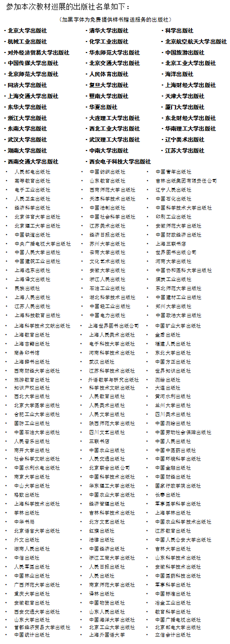 尊敬的教務(wù)處、教材科領(lǐng)導(dǎo)及各位老師: 中教圖書的成長得益于您的大力支持,在此向您表示真誠的感謝。 教材選采作為教學(xué)管理工作的重要組成部分直接影響著學(xué)校的教學(xué)和科研水平,也直接關(guān)系到學(xué)生的就業(yè)和繼續(xù)深造的前景。隨著互聯(lián)網(wǎng)信息服務(wù)的高速發(fā)展,教材巡展的網(wǎng)絡(luò)化作為教材行業(yè)的創(chuàng)新模式已成為市場所需、人心所向。首先,在網(wǎng)上進(jìn)行教材巡展具有成本最低、品種最全、產(chǎn)品最新、人數(shù)不限、時(shí)間靈活、常態(tài)巡展的優(yōu)勢。其次,在網(wǎng)上進(jìn)行教材巡展解決了任課教師和出版社一直困擾的出版信息不通暢以及適合不同專業(yè)、不同層次、不同方向的最新、熱點(diǎn)、精品教材不能第一時(shí)間知會學(xué)校和任課教師的問題,可以最大化地提高任課教師選擇教材的準(zhǔn)確性和專業(yè)性,提高精品教材選用率,有效提高教學(xué)質(zhì)量。 為了更好地為學(xué)校的教學(xué)和科研提供優(yōu)質(zhì)服務(wù),山東中教產(chǎn)業(yè)發(fā)展股份有限公司(股票簡稱:中教產(chǎn)業(yè))聯(lián)合出版社在中教圖書網(wǎng)上搭建了目前國內(nèi)最專業(yè)的“教材巡展網(wǎng)上服務(wù)平臺”,旨在免費(fèi)提供任課教師與出版社之間的選書、贈送樣書等互動服務(wù),著力打造科學(xué)化、現(xiàn)代化的教材巡展新模式。該服務(wù)平臺的教材產(chǎn)品按出版社、學(xué)科和中圖分類法分類,可以常態(tài)化的向任課教師提供北京大學(xué)出版社、清華大學(xué)出版社、中國科技出版?zhèn)髅、機(jī)械工業(yè)出版社等全國近400家出版社的教材產(chǎn)品信息,并可按專業(yè)、書名、作者、出版社進(jìn)行產(chǎn)品搜索、選擇。同時(shí),平臺還設(shè)立了新書推薦、國家級規(guī)劃教材推薦、出版社推薦精品教材等信息服務(wù)專區(qū),具備專家推薦的功能,極大的方便了任課教師的選書需要。另外,平臺還可為任課教師提供與出版社之間的樣書選贈互動服務(wù),任課教師通過登陸教務(wù)處網(wǎng)站(教材科網(wǎng)站)或中教圖書網(wǎng)(www.book1993.com),點(diǎn)擊“教材巡展網(wǎng)上行”,即可在網(wǎng)上向參加教材巡展并提供樣書贈送服務(wù)的出版社申請樣書,出版社相關(guān)人員登陸網(wǎng)站后臺下載任課教師填報(bào)的樣書需求信息以及出版意向信息,并將處理結(jié)果適時(shí)反饋任課教師。 中教產(chǎn)業(yè)在業(yè)內(nèi)開創(chuàng)了教材巡展網(wǎng)絡(luò)化的先河,隨著平臺的不斷完善,“教材巡展網(wǎng)上行”已成為常態(tài)化。目前,該平臺擁有國內(nèi)近400家出版社的20多萬條最新教材書目,已經(jīng)在為山東省內(nèi)及全國600多所高校的教師提供服務(wù)。 2019春季教材巡展網(wǎng)上行將于2018年11月7日開始,我們真誠邀請各高校及任課教師參加“中教圖書2019春季教材巡展網(wǎng)上行”,并對您的支持和信任表示感謝。
