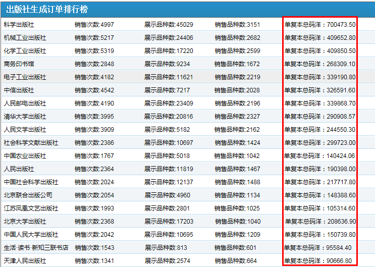 出版社單復本銷售碼洋百強榜 (特別提示:1.本榜單是將產品按單副本進行統計2.本榜單不包含圖書館采編人員使用采訪數據、現貨目錄批量下載功能和采集器掃碼選采功能形成的訂單碼洋;3.網上館配會平臺展示圖書品種數均為出版社可供品種,實時動態(tài)更新) ![]()