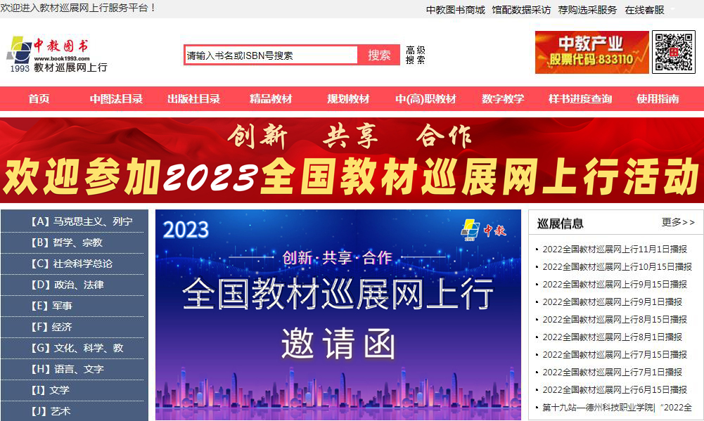 尊敬的教務(wù)處、院系領(lǐng)導(dǎo)及各位老師: 中教產(chǎn)業(yè)的成長(zhǎng)受益于您的大力支持,在此,向您表示誠(chéng)摯的感謝! 新冠疫情爆發(fā)以來,傳統(tǒng)的線下教材巡展無法正常進(jìn)行。在全國(guó)人民認(rèn)真學(xué)習(xí)黨的二十大精神的指引下,中教產(chǎn)業(yè)深入貫徹《習(xí)近平新時(shí)代中國(guó)特色社會(huì)主義思想進(jìn)課程教材指南》,積極落實(shí)教育部《普通高等學(xué)校教材管理辦法》和《職業(yè)院校教材管理辦法》, 秉承“根植教育,服務(wù)教育”的宗旨,發(fā)揮技術(shù)和行業(yè)資源優(yōu)勢(shì)。在成功舉辦了2020、2021和2022“全國(guó)教材巡展網(wǎng)上行”的基礎(chǔ)上,于2022年11月17日繼續(xù)啟動(dòng)“2023全國(guó)教材巡展網(wǎng)上行”活動(dòng),努力為“后疫情時(shí)期”學(xué)校教材建設(shè)提供創(chuàng)新優(yōu)質(zhì)服務(wù)。在此,中教產(chǎn)業(yè)誠(chéng)摯邀請(qǐng)全國(guó)各高校、中職學(xué)校及廣大任課教師積極參與本次活動(dòng)! 現(xiàn)將巡展相關(guān)事項(xiàng)說明如下: 1.網(wǎng)站名稱和網(wǎng)址 網(wǎng)站名稱:教材巡展網(wǎng)上行 網(wǎng) 址:www.jcxzwsx.com 2.巡展時(shí)間 2022年11月17日--2023年11月17日(全年常態(tài)化服務(wù)) 自2020教材巡展網(wǎng)上行上線以來,得到了學(xué)校教務(wù)處、教材科及各院系任課教師的廣泛認(rèn)可。廣大出版社及平臺(tái)運(yùn)營(yíng)方積極參與、精心運(yùn)營(yíng),克服了政策羈絆及數(shù)據(jù)桎梏,打破了時(shí)空壁壘,完美規(guī)避了疫情對(duì)教材巡展的巨大影響。線上巡展模式,有效保障了學(xué)校教材建設(shè)工作不受疫情影響,得到了各方的一致認(rèn)可。隨著2022全國(guó)教材巡展網(wǎng)上行于11月17日閉幕,教材巡展的網(wǎng)絡(luò)化作為教材行業(yè)的創(chuàng)新模式已成為市場(chǎng)所需、人心所向,線上巡展已成為疫情防控期間甚至后疫情時(shí)期的主流巡展方式。應(yīng)學(xué)校教材建設(shè)部門、參展老師及廣大參會(huì)出版社的要求,“2023全國(guó)教材巡展網(wǎng)上行” 將繼續(xù)全年無休常態(tài)化提供服務(wù)。網(wǎng)上巡展期間,在條件允許的情況下,為滿足不同的需求將舉辦線上線下同步巡展。 3.巡展參與出版社及教材品類 “2023全國(guó)教材巡展網(wǎng)上行”活動(dòng)得到了科學(xué)出版社、清華大學(xué)出版社、北京大學(xué)出版社、電子工業(yè)出版社、化學(xué)工業(yè)出版社、人民郵電出版社、機(jī)械工業(yè)出版社、北京師范大學(xué)出版社、中國(guó)建筑工業(yè)出版社、人民交通出版社、上海外語教育出版社、復(fù)旦大學(xué)出版社等160多家以教材出版為主的出版社的大力支持和積極參與,其中贈(zèng)送教材樣書的出版社53家,可贈(zèng)送教材樣書品種186924種。本次線上教材巡展活動(dòng)將重點(diǎn)展示各家出版社近三年出版的各類獲獎(jiǎng)教材、規(guī)劃教材和精品教材。 4.巡展服務(wù)學(xué)校 “2023全國(guó)教材巡展網(wǎng)上行”活動(dòng)的服務(wù)對(duì)象為全國(guó)所有的高校、中職學(xué)校及廣大任課教師,歡迎廣大教師積極參與。 “2023全國(guó)教材巡展網(wǎng)上行”得到了廣大學(xué)校教材建設(shè)管理和服務(wù)部門的大力支持與積極參與。在2022年全國(guó)教材巡展網(wǎng)上行舉辦期間,共有800多所高校的任課教師參與教材巡展活動(dòng),申請(qǐng)教材樣書次數(shù)達(dá)到上萬次,預(yù)計(jì)今年的參展學(xué)校將會(huì)突破1000所。 5.教材免費(fèi)申請(qǐng)及郵寄 參加教材巡展的老師在教材巡展網(wǎng)上行平臺(tái)上填表均可獲贈(zèng)與自己所教授課程相符的各家出版社提供的1-2本教材樣書(在線填表后即可郵寄)。教師有出版意向或?qū)W校有教學(xué)資源建設(shè)方面的需求可在在線填寫樣書申請(qǐng)單時(shí)備注,也可與教材巡展網(wǎng)上行平臺(tái)聯(lián)系。 教材巡展網(wǎng)上行在助力學(xué)校教材建設(shè)方面相較于線下教材巡展具備以下優(yōu)勢(shì):首先,在網(wǎng)上進(jìn)行教材巡展具有成本低、品種全、產(chǎn)品新、人數(shù)不限、時(shí)間靈活、常態(tài)巡展的優(yōu)勢(shì)。其次,在網(wǎng)上進(jìn)行教材巡展解決了任課教師和出版社一直困擾的出版信息不通暢以及適合不同專業(yè)、不同層次、不同方向的最新、熱點(diǎn)、精品教材不能第一時(shí)間知會(huì)學(xué)校和任課教師的問題,可以極大的提高任課教師選擇教材的準(zhǔn)確性和專業(yè)性,提高精品教材選用率。平臺(tái)的教材產(chǎn)品按出版社、中圖分類法分類,可以常態(tài)化的向任課教師提供全國(guó)160多家以教材出版為主的出版社的30多萬種教材產(chǎn)品信息,并可按專業(yè)、書名、作者、出版社進(jìn)行產(chǎn)品搜索、選擇。同時(shí),平臺(tái)設(shè)立了規(guī)劃教材、精品教材、高職中職教材、數(shù)字教學(xué)等服務(wù)專區(qū),科學(xué)出版社、清華大學(xué)出版社、電子工業(yè)出版社等部分教材重點(diǎn)出版社還在平臺(tái)上線了教材的試讀、推薦視頻、隨書課件及部分教材的視頻課程,極大的方便了任課教師的選書需要。同時(shí),平臺(tái)還可為任課教師提供與出