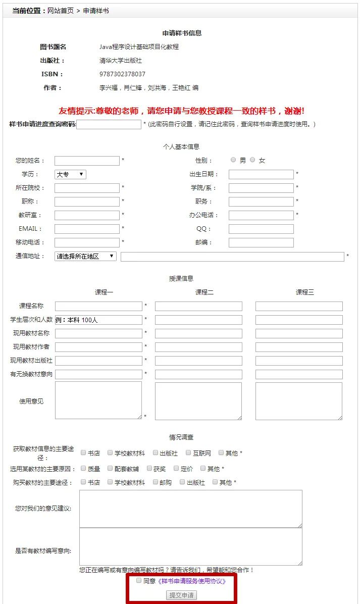 2.申請(qǐng)樣書 任課教師可以通過點(diǎn)擊“教材巡展網(wǎng)上行”平臺(tái)首頁(yè)的“教材巡展提供樣書贈(zèng)送服務(wù)的出版社”查找教材,在教材詳細(xì)頁(yè)面點(diǎn)擊免費(fèi)申請(qǐng)樣書,填寫真實(shí)的任課教師信息即可免費(fèi)申請(qǐng)。 【特別提示】部分出版社教材可以提供試讀,點(diǎn)擊我要預(yù)覽可以試讀教材的前三十頁(yè)內(nèi)容。