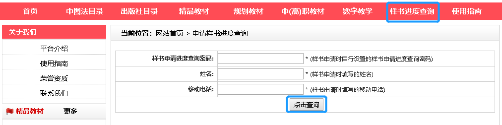 3.樣書申請(qǐng)進(jìn)度查詢 點(diǎn)擊導(dǎo)航欄下的樣書進(jìn)度查詢,輸入樣書申請(qǐng)時(shí)填寫的樣書申請(qǐng)進(jìn)度查詢密碼、姓名以及移動(dòng)電話,可以查詢樣書申請(qǐng)出版社審核情況等。
