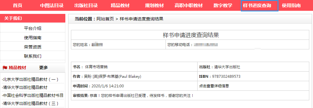 輸入個(gè)人信息,點(diǎn)擊查詢后,可以看到當(dāng)前申請(qǐng)樣書的進(jìn)度情況。如下圖: