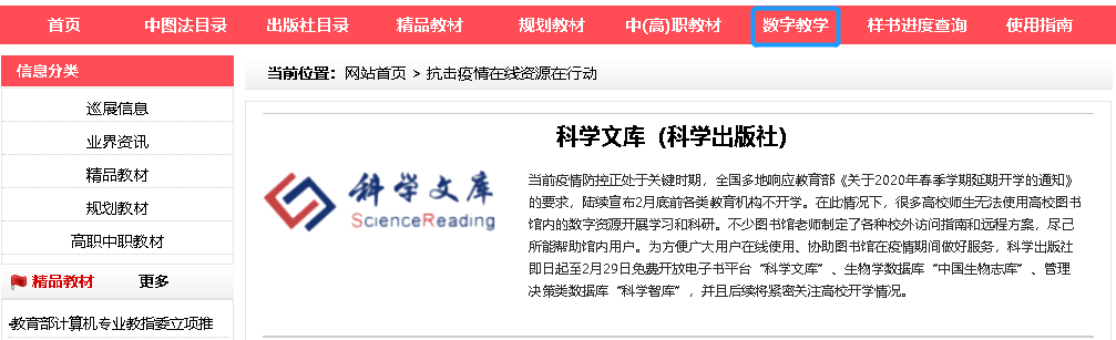 4.數(shù)字教學(xué) 點(diǎn)擊導(dǎo)航欄下的數(shù)字教學(xué),即可展現(xiàn)部分出版單位的數(shù)據(jù)庫(kù)以及電子版教材、課程資源、課件、教學(xué)軟件、慕課、微課等,可以試讀、試用、選采。