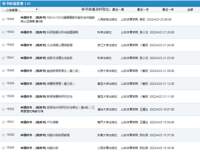 教材郵寄:線上巡展期間,每家出版社均可申請1-2本教材樣書(在線填表后郵寄)。有出版意向教師和有教學(xué)資源建設(shè)方面需求的學(xué)院可以與教材巡展網(wǎng)上行平臺聯(lián)系,也可在填寫樣書申請單時(shí)備注。 服務(wù)電話:400-0531-123 按6鍵 0531-83532279 0531-83532287 作為“2022全國教材巡展網(wǎng)上行” 線上巡展活動的第三站,學(xué)校對本次活動給予了大力支持。活動首日本院校已有教師累計(jì)已有59人次在線申請樣書。下圖為本院校在“教材巡展網(wǎng)上行平臺”樣書申請動態(tài)(為保護(hù)用戶隱私信息,圖片相關(guān)位置已做模糊處理)。