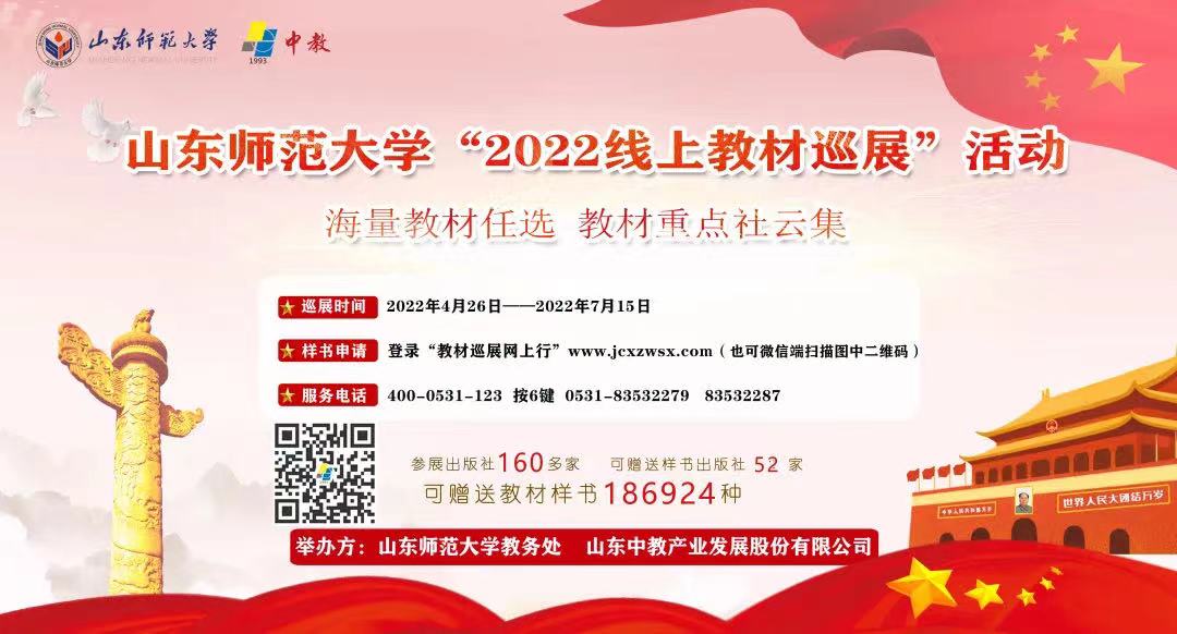 為深入貫徹落實《習(xí)近平新時代中國特色社會主義思想進(jìn)課程教材指南》,落實教育部《普通高等學(xué)校教材管理辦法》,方便各學(xué)校遴選教材,選擇一批適宜教學(xué),符合本校人才培養(yǎng)方案、教學(xué)計劃和教學(xué)大綱要求的優(yōu)秀教材,“2022全國教材巡展網(wǎng)上行” 教材云巡展活動第五站——山東師范大學(xué)站于4月26日正式啟動。根據(jù)相關(guān)防疫要求,本次活動采取線上(教材云巡展)方式進(jìn)行。