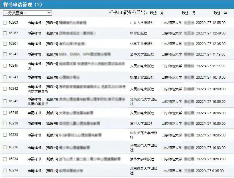 作為“2022全國教材巡展網(wǎng)上行” 線上巡展活動的第五站,學(xué)校對本次活動給予了大力支持。活動首日,本院校累計已有107人次在線申請樣書。下圖為本院校在“教材巡展網(wǎng)上行平臺”樣書申請動態(tài)(為保護(hù)用戶隱私信息,圖片相關(guān)位置已做模糊處理)。