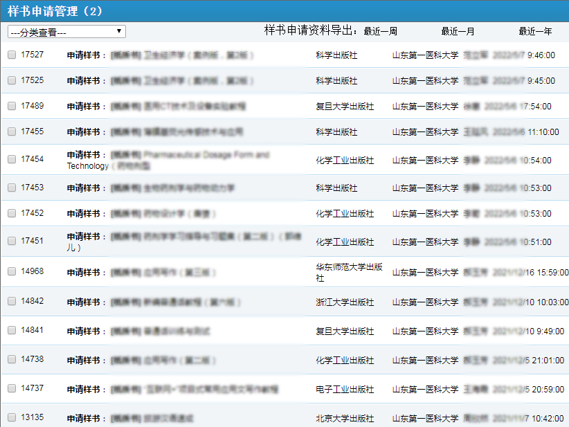作為“2022全國教材巡展網(wǎng)上行”線上巡展活動的第十三站,學(xué)校對本次活動給予了大力支持;顒邮兹,本院校累計(jì)已有38人次在線申請樣書。下圖為本院校在“教材巡展網(wǎng)上行平臺”樣書申請動態(tài)(為保護(hù)用戶隱私信息,圖片相關(guān)位置已做模糊處理)。