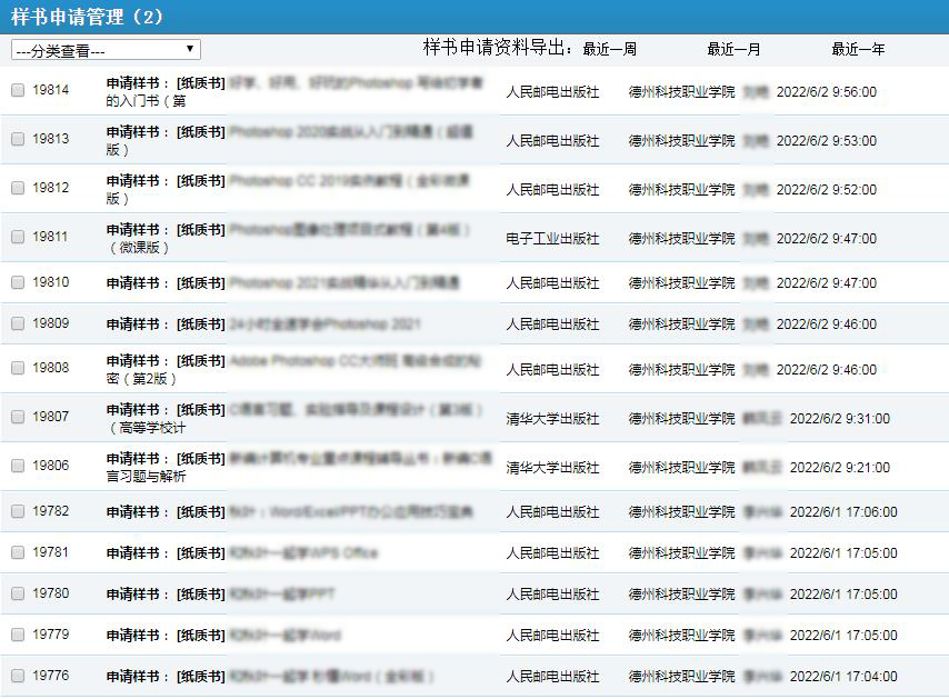 巡展時(shí)間:2022年6月2日—2022年7月20日(也可全年常態(tài)化服務(wù)) 教材郵寄:線上巡展期間,每家出版社均可申請(qǐng)1-2本教材樣書(在線填表后郵寄)。有出版意向教師和有教學(xué)資源建設(shè)方面需求的學(xué)院可以與教材巡展網(wǎng)上行平臺(tái)聯(lián)系,也可在填寫樣書申請(qǐng)單時(shí)備注。 服務(wù)電話:400-0531-123 按6鍵 0531-83532279 0531-83532287 作為“2022全國(guó)教材巡展網(wǎng)上行” 線上巡展活動(dòng)的第十九站,學(xué)校對(duì)本次活動(dòng)給予了大力支持;顒(dòng)首日,本院校累計(jì)已有38 人次在線申請(qǐng)樣書。下圖為本院校在“教材巡展網(wǎng)上行平臺(tái)”樣書申請(qǐng)動(dòng)態(tài)(為保護(hù)用戶隱私信息,圖片相關(guān)位置已做模糊處理)。
