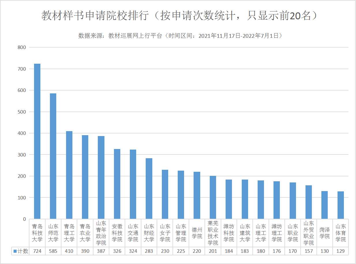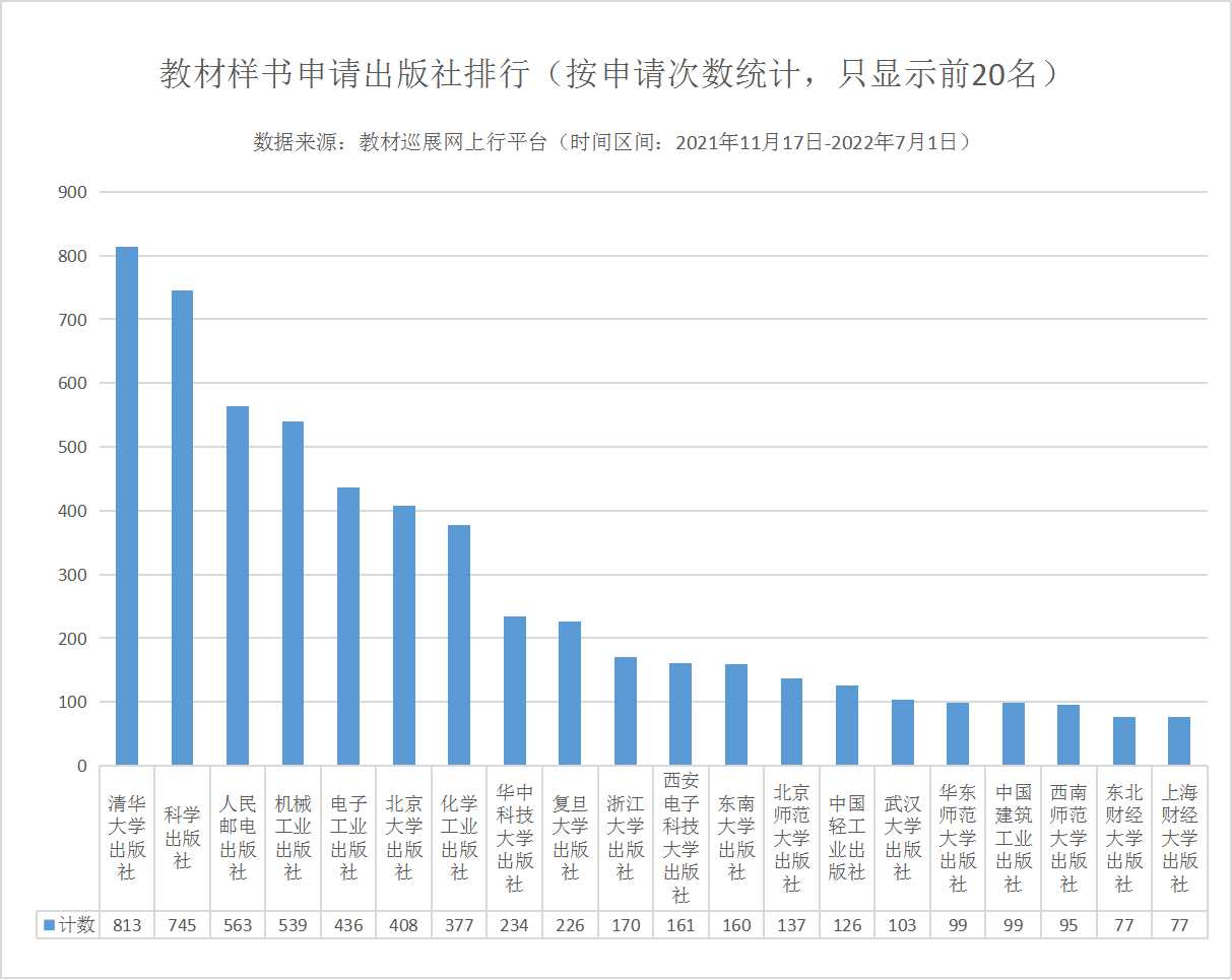 2021年11月17日,“2022全國教材巡展網上行”正式拉開帷幕。 本次活動依托于“教材巡展網上行”(www.jcxzwsx.com)服務平臺,聯(lián)合科學出版社、清華大學出版社、北京大學出版社、電子工業(yè)出版社、化學工業(yè)出版社、機械工業(yè)出版社、人民郵電出版社、人民交通出版社、上海外語教育出版社、外語教學與研究出版社、北京師范大學出版社、復旦大學出版社、國防工業(yè)出版社等160多家以教材出版為主的出版社,并得到了學校教材管理服務部門的大力支持,打造出一條連接出版社和各學科任課老師的教材信息交流通道,為各學科任課老師的教材選用、教材樣書免費申請、自編教材的出版等方面提供優(yōu)質的服務。 “2022全國教材巡展網上行”上線以來,得到了高校教材管理部門及出版社同仁的大力支持及肯定,在此我們深表感謝。為了滿足學校和出版社的要求,從2021年11月17日開始我們定時播報教材巡展網上行的各類數(shù)據(jù)統(tǒng)計,并保證數(shù)據(jù)的真實性和有效性。 截止到2022年7月1日15時(統(tǒng)計區(qū)間:2021年11月17日0時-2022年7月1日15時) 訪問/展示數(shù)據(jù): 教材巡展網上行平臺頁面訪問數(shù)(PV):261862次 IP訪問數(shù):77621次 參會出版社參展品種:351516種 可贈送教材樣書品種:186924種 目前平臺上參展出版社160多家,其中贈送教材樣書的出版社52家(見下圖,均為綜合類出版大社及以教材出版為主的專業(yè)出版社)
