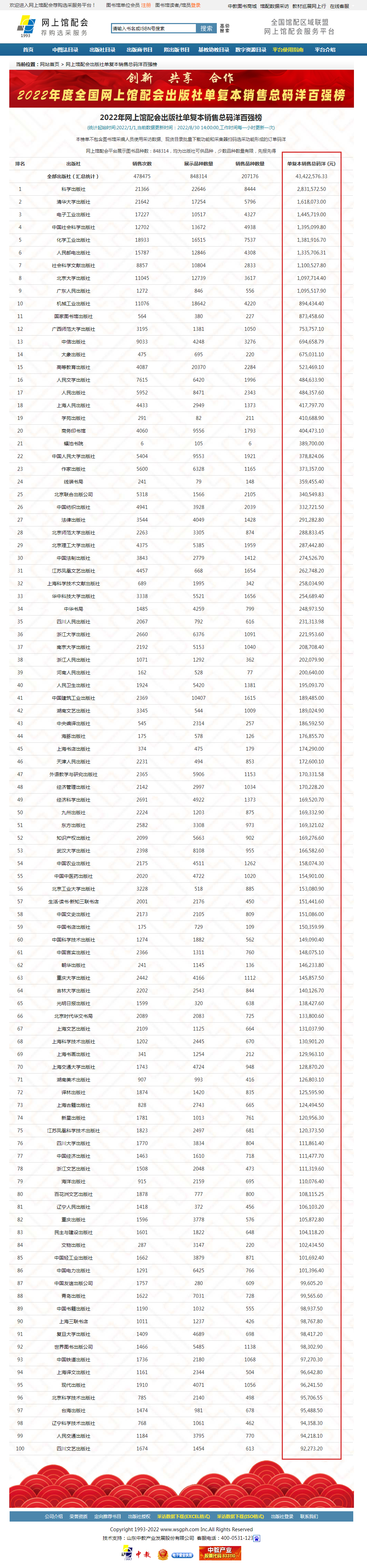八月將盡,恰逢初秋,“2022年全國(guó)網(wǎng)上館配會(huì)”選采工作進(jìn)入了階段性的高潮!截止到8月30日下午14時(shí):出版社單復(fù)本銷售碼洋達(dá)到了43,422,576.33元!2022全國(guó)網(wǎng)上館配會(huì)自2022年1月1日上線以來(lái),開啟了全年常態(tài)化服務(wù)。參展單位涵蓋了全國(guó)98%以上的主流出版機(jī)構(gòu),包括參會(huì)出版社556家;出版商15家;館配中盤6家。 現(xiàn)將平臺(tái)各類數(shù)據(jù)統(tǒng)計(jì)列表呈現(xiàn)如下: 1.出版社單復(fù)本銷售碼洋百?gòu)?qiáng)榜 【特別提示】1.本榜單是將產(chǎn)品按單副本進(jìn)行統(tǒng)計(jì)2.本榜單不包含圖書館采編人員使用采訪數(shù)據(jù)、現(xiàn)貨目錄批量下載功能和采集器掃碼選采功能形成的訂單碼洋3.網(wǎng)上館配會(huì)平臺(tái)展示圖書品種數(shù)均為出版社可供品種,并實(shí)時(shí)更新。