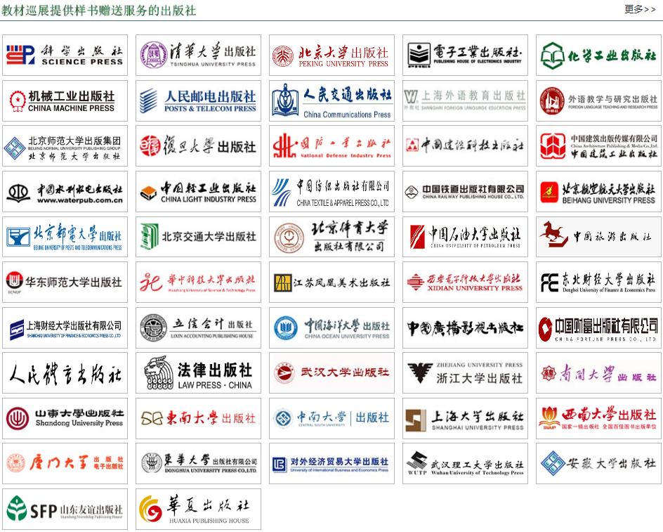 以上為參與教材樣書贈送的52家出版社圖標 參與教材樣書申請學校共:571所 教材樣書申請次數(shù):7412次