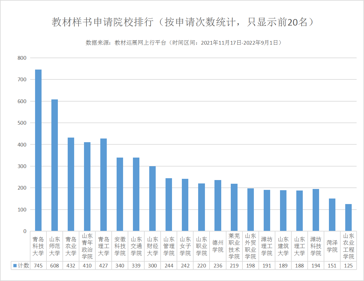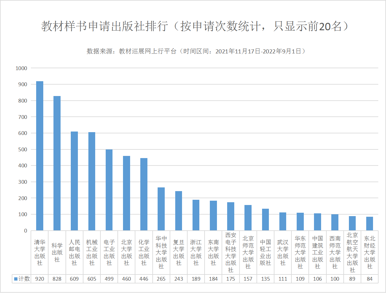 2021年11月17日,“2022全國教材巡展網(wǎng)上行”正式拉開帷幕。 本次活動依托于“教材巡展網(wǎng)上行”(www.jcxzwsx.com)服務平臺,聯(lián)合科學出版社、清華大學出版社、北京大學出版社、電子工業(yè)出版社、化學工業(yè)出版社、機械工業(yè)出版社、人民郵電出版社、人民交通出版社、上海外語教育出版社、外語教學與研究出版社、北京師范大學出版社、復旦大學出版社、國防工業(yè)出版社等160多家以教材出版為主的出版社,并得到了學校教材管理服務部門的大力支持,打造出一條連接出版社和各學科任課老師的教材信息交流通道,為各學科任課老師的教材選用、教材樣書免費申請、自編教材的出版等方面提供優(yōu)質的服務。 “2022全國教材巡展網(wǎng)上行”上線以來,得到了高校教材管理部門及出版社同仁的大力支持及肯定,在此我們深表感謝。為了滿足學校和出版社的要求,從2021年11月17日開始我們定時播報教材巡展網(wǎng)上行的各類數(shù)據(jù)統(tǒng)計,并保證數(shù)據(jù)的真實性和有效性。 截止到2022年9月1日12時(統(tǒng)計區(qū)間:2021年11月17日0時-2022年9月1日12時) 訪問/展示數(shù)據(jù): 教材巡展網(wǎng)上行平臺頁面訪問數(shù)(PV):318002次 IP訪問數(shù):99422次 參會出版社參展品種:351039種 可贈送教材樣書品種:186924種 目前平臺上參展出版社160多家,其中贈送教材樣書的出版社52家(見下圖,均為綜合類出版大社及以教材出版為主的專業(yè)出版社)