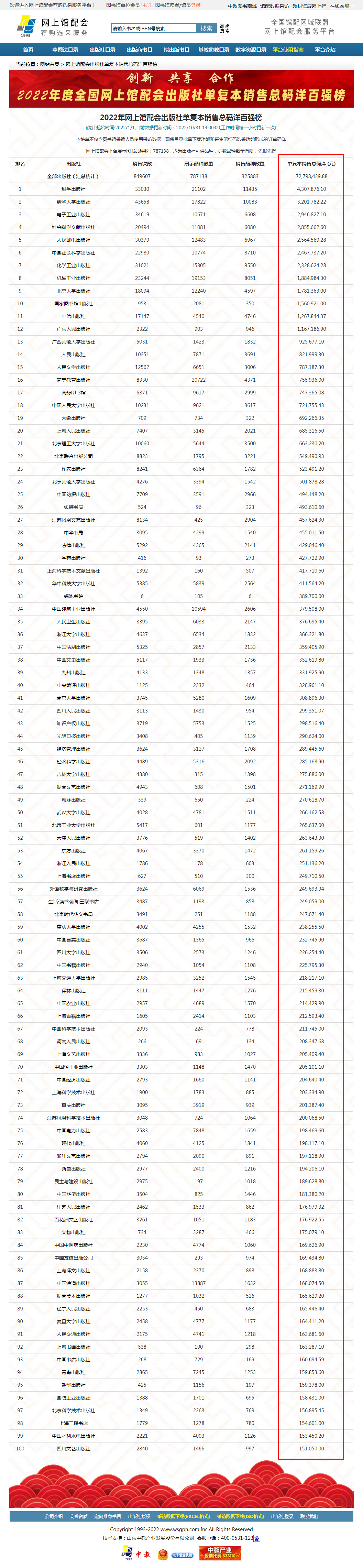 11月即將開啟,“2022年全國網(wǎng)上館配會”選采工作進(jìn)入了階段性的高潮!截止到10月31日下午14時(shí):出版社單復(fù)本銷售碼洋達(dá)到了72,798,439.88元!2022全國網(wǎng)上館配會自2022年1月1日上線以來,開啟了全年常態(tài)化服務(wù)。參展單位涵蓋了全國98%以上的主流出版機(jī)構(gòu),包括參會出版社556家;出版商15家;館配中盤6家。 現(xiàn)將平臺各類數(shù)據(jù)統(tǒng)計(jì)列表呈現(xiàn)如下: 1.出版社單復(fù)本銷售碼洋百強(qiáng)榜 【特別提示】1.本榜單是將產(chǎn)品按單副本進(jìn)行統(tǒng)計(jì)2.本榜單不包含圖書館采編人員使用采訪數(shù)據(jù)、現(xiàn)貨目錄批量下載功能和采集器掃碼選采功能形成的訂單碼洋3.網(wǎng)上館配會平臺展示圖書品種數(shù)均為出版社可供品種,并實(shí)時(shí)更新。