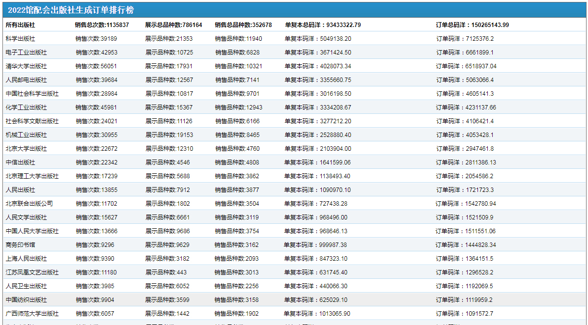 時值冬月,“2022年全國網(wǎng)上館配會”選采工作進入了最后的沖刺階段!截止到11月21日下午17時:出版社單復(fù)本銷售碼洋達到了93,433,322.79元!2022全國網(wǎng)上館配會自2022年1月1日上線以來,開啟了全年常態(tài)化服務(wù)。參展單位涵蓋了全國98%以上的主流出版機構(gòu),包括參會出版社556家;出版商15家;館配中盤6家。 現(xiàn)將平臺各類數(shù)據(jù)統(tǒng)計列表呈現(xiàn)如下: 1.出版社單復(fù)本銷售碼洋百強榜 【特別提示】1.本榜單是將產(chǎn)品按單副本進行統(tǒng)計2.本榜單不包含圖書館采編人員使用采訪數(shù)據(jù)、現(xiàn)貨目錄批量下載功能和采集器掃碼選采功能形成的訂單碼洋3.網(wǎng)上館配會平臺展示圖書品種數(shù)均為出版社可供品種,并實時更新。
