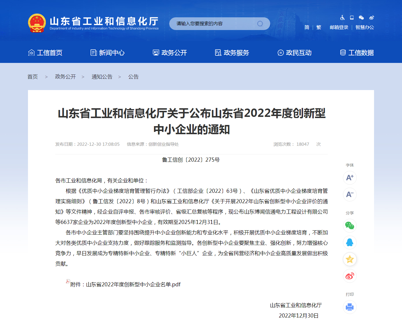 (山東省2022年度創(chuàng)新型中小企業(yè)名單截圖)
