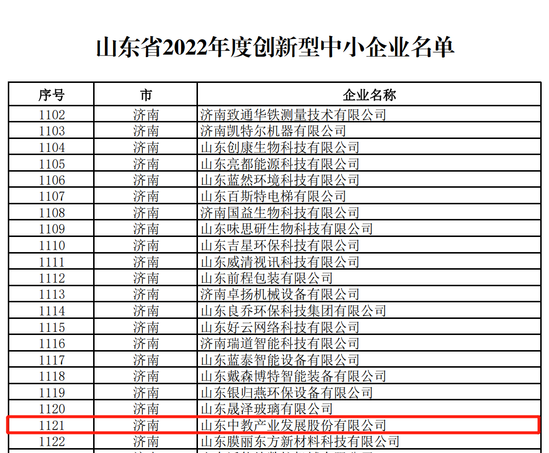 > 喜報(bào)│山東中教產(chǎn)業(yè)發(fā)展股份有限公司被認(rèn)定為山東省2022年度創(chuàng)新型中小企業(yè)