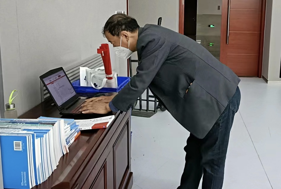 ▷老師在現(xiàn)場通過線上自助申請教材樣書