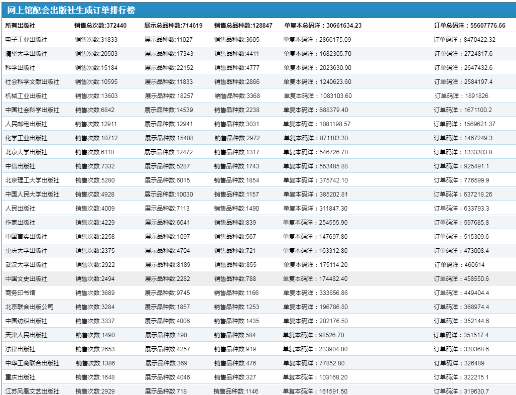 夏季伊始,“2023年全國網(wǎng)上館配會”選采工作進入了階段性高潮。截止到5月27日下午14時:出版社單復本銷售碼洋達到了30,661,634.23元!2023全國網(wǎng)上館配會自2023年1月1日上線以來,開啟了全年常態(tài)化服務(wù)。參展單位涵蓋了全國98%以上的主流出版機構(gòu),包括參會出版社577家;出版商15家;館配中盤6家。 現(xiàn)將平臺各類數(shù)據(jù)統(tǒng)計列表呈現(xiàn)如下: 1.出版社單復本銷售碼洋百強榜 【特別提示】1.本榜單是將產(chǎn)品按單復本進行統(tǒng)計2.本榜單不包含圖書館采編人員使用采訪數(shù)據(jù)、現(xiàn)貨目錄批量下載功能和采集器掃碼選采功能形成的訂單碼洋3.網(wǎng)上館配會平臺展示圖書品種數(shù)均為出版社可供品種,并實時更新。