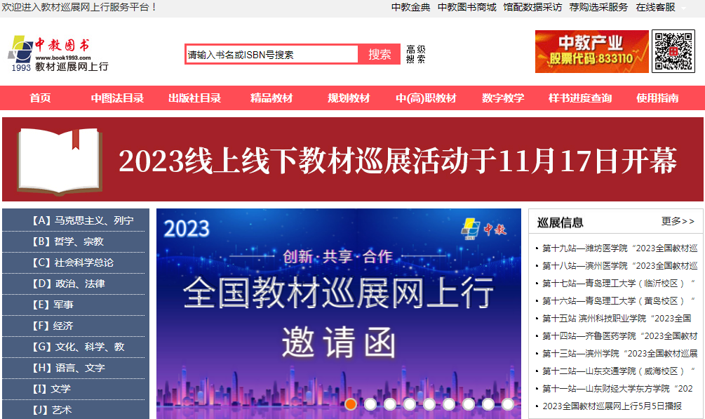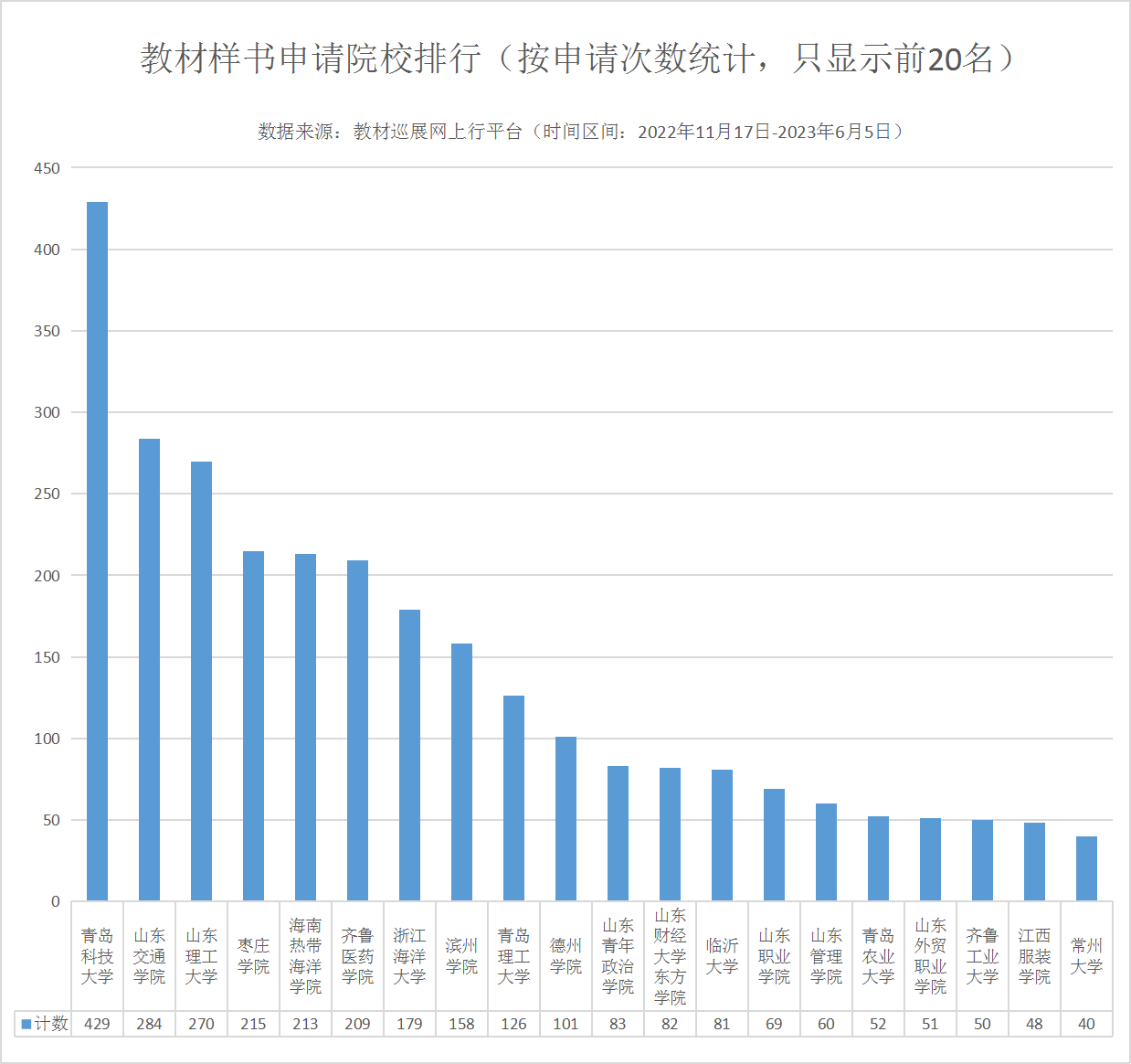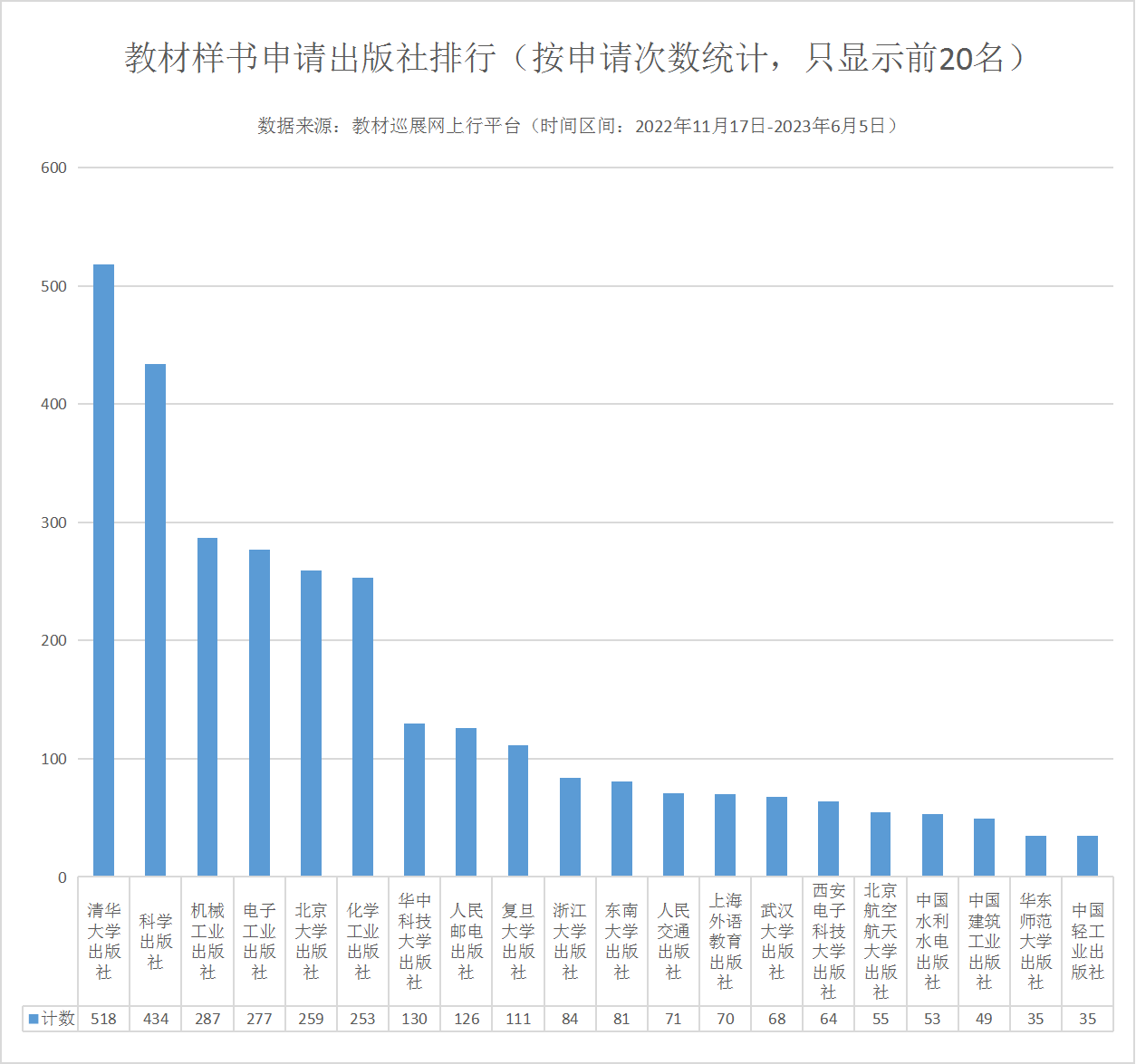 2022年11月17日,“2023全國教材巡展網(wǎng)上行”正式拉開帷幕。 本次活動依托于“教材巡展網(wǎng)上行”(www.jcxzwsx.com)服務平臺,聯(lián)合科學出版社、清華大學出版社、北京大學出版社、電子工業(yè)出版社、化學工業(yè)出版社、機械工業(yè)出版社、人民郵電出版社、人民交通出版社、上海外語教育出版社、外語教學與研究出版社、復旦大學出版社、國防工業(yè)出版社等169家以教材出版為主的出版社,并得到了學校教材管理服務部門的大力支持,打造出一條連接出版社和各學科任課老師的教材信息交流通道,為各學科任課老師的教材選用、教材樣書免費申請、自編教材的出版等方面提供優(yōu)質(zhì)的服務。 “2023全國教材巡展網(wǎng)上行”上線以來,得到了高校教材管理部門及出版社同仁的大力支持及肯定,在此我們深表感謝!為了滿足學校和出版社的要求,從2022年11月17日開始我們定時播報教材巡展網(wǎng)上行的各類數(shù)據(jù)統(tǒng)計,并保證數(shù)據(jù)的真實性和有效性。