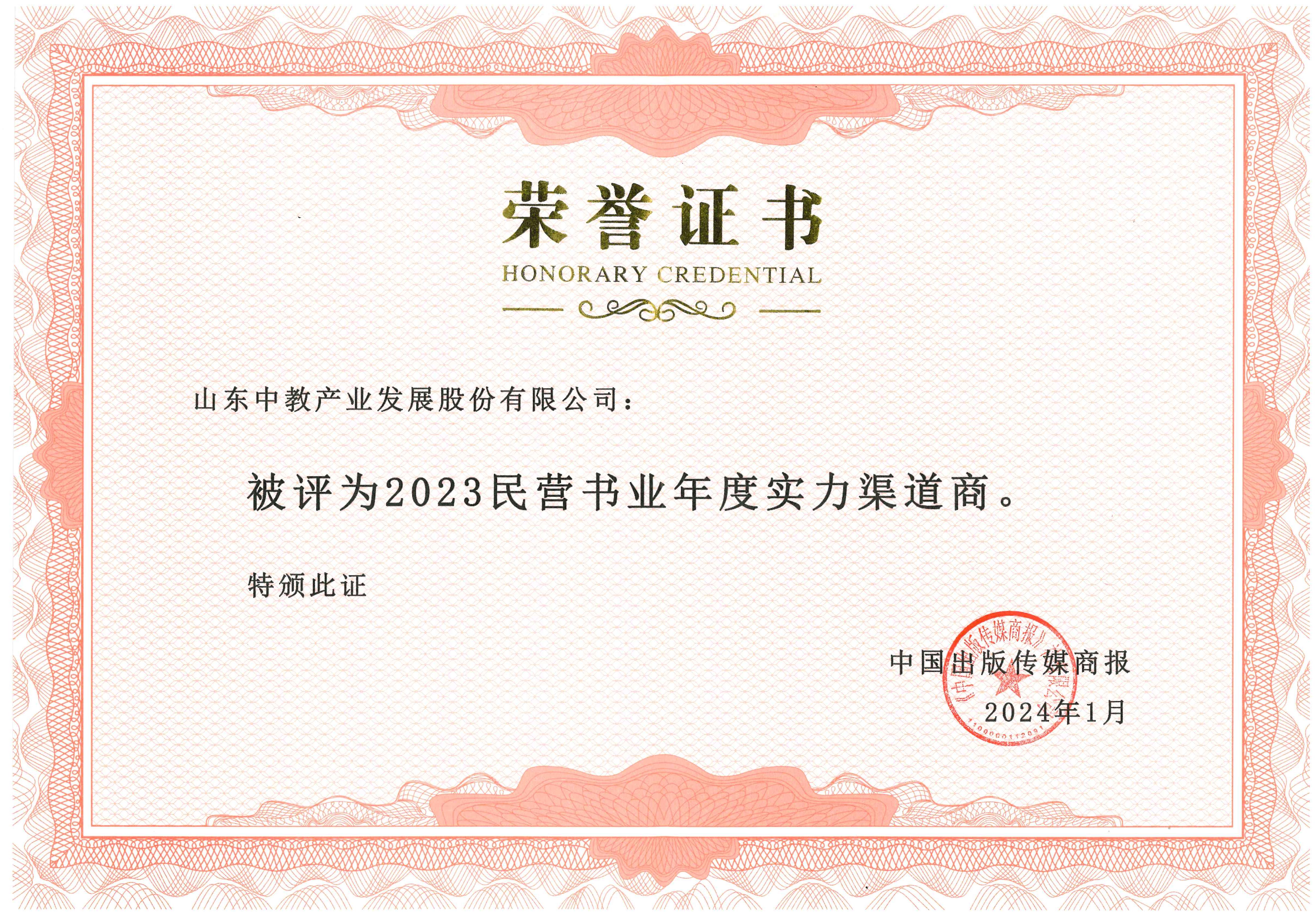 喜報│山東中教產(chǎn)業(yè)發(fā)展股份有限公司榮獲“2023民營書業(yè)年度實力渠道商”稱號