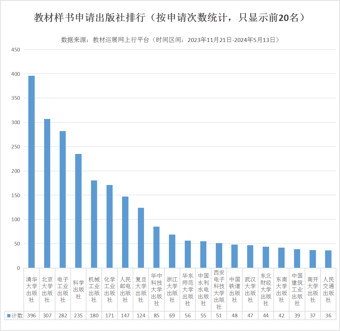 2023年11月21日,“2024全國教材巡展網(wǎng)上行”正式拉開帷幕。 本次活動依托于“教材巡展網(wǎng)上行”(www.jcxzwsx.com)服務(wù)平臺,聯(lián)合科學(xué)出版社、清華大學(xué)出版社、北京大學(xué)出版社、電子工業(yè)出版社、化學(xué)工業(yè)出版社、機(jī)械工業(yè)出版社、人民郵電出版社、人民交通出版社、上海外語教育出版社、外語教學(xué)與研究出版社、復(fù)旦大學(xué)出版社、國防工業(yè)出版社等170家以教材出版為主的出版社,并得到了學(xué)校教材管理服務(wù)部門的大力支持,打造出一條連接出版社和各學(xué)科任課老師的教材信息交流通道,為各學(xué)科任課老師的教材選用、教材樣書免費(fèi)申請、自編教材的出版等方面提供優(yōu)質(zhì)的服務(wù)。 “2024全國教材巡展網(wǎng)上行”上線以來,得到了高校教材管理部門及出版社同仁的大力支持及肯定,在此我們深表感謝!為了滿足學(xué)校和出版社的要求,從2023年11月21日開始我們定時播報教材巡展網(wǎng)上行的各類數(shù)據(jù)統(tǒng)計,并保證數(shù)據(jù)的真實性和有效性。