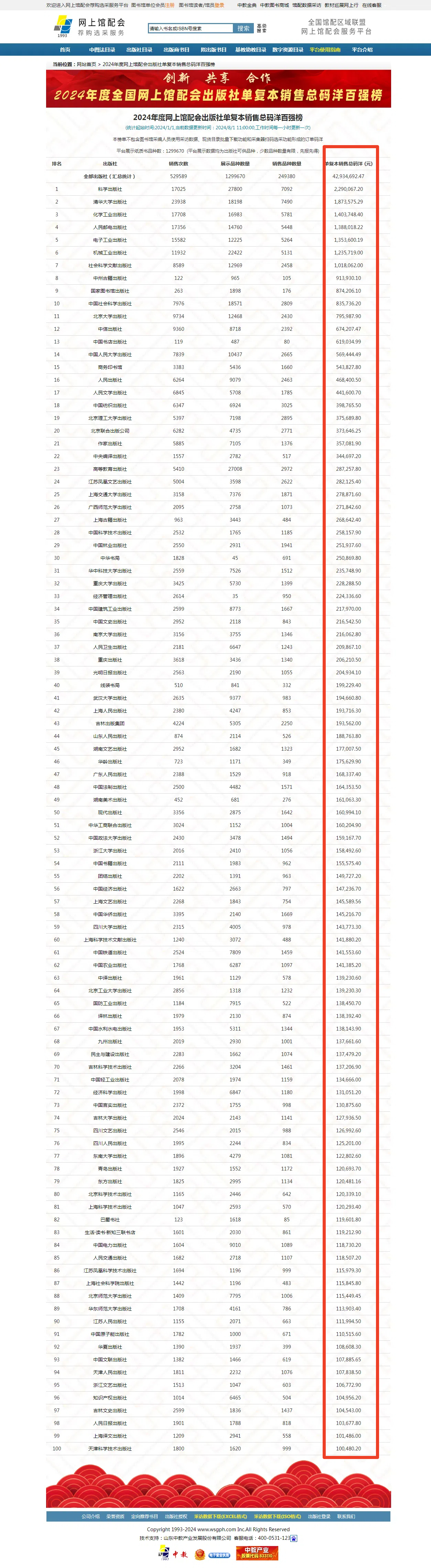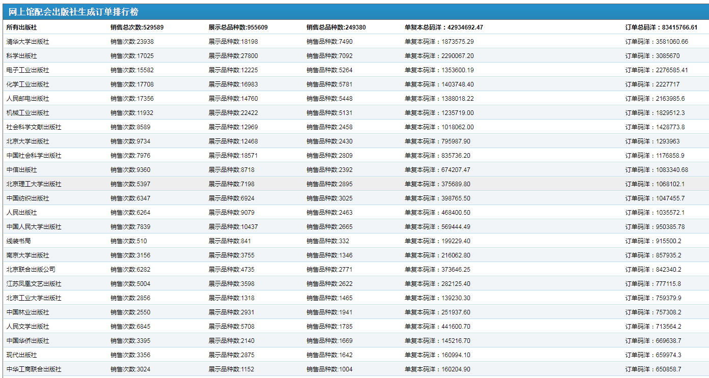 1.出版社單復(fù)本銷售碼洋百強榜 【特別提示】1.本榜單是將產(chǎn)品按單副本進行統(tǒng)計2.本榜單不包含圖書館采編人員使用采訪數(shù)據(jù)、現(xiàn)貨目錄批量下載功能和采集器掃碼選采功能形成的訂單碼洋3.網(wǎng)上館配會平臺展示圖書品種數(shù)均為出版社可供品種,并實時更新。