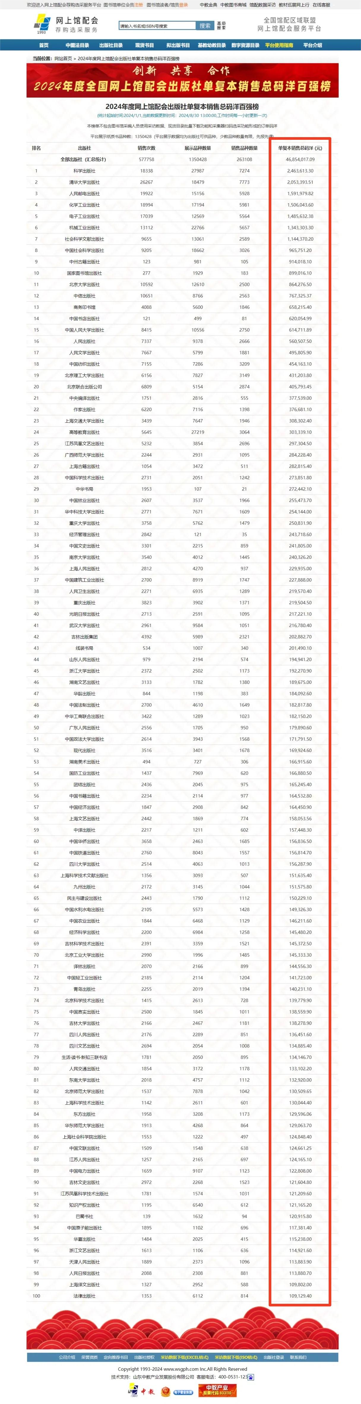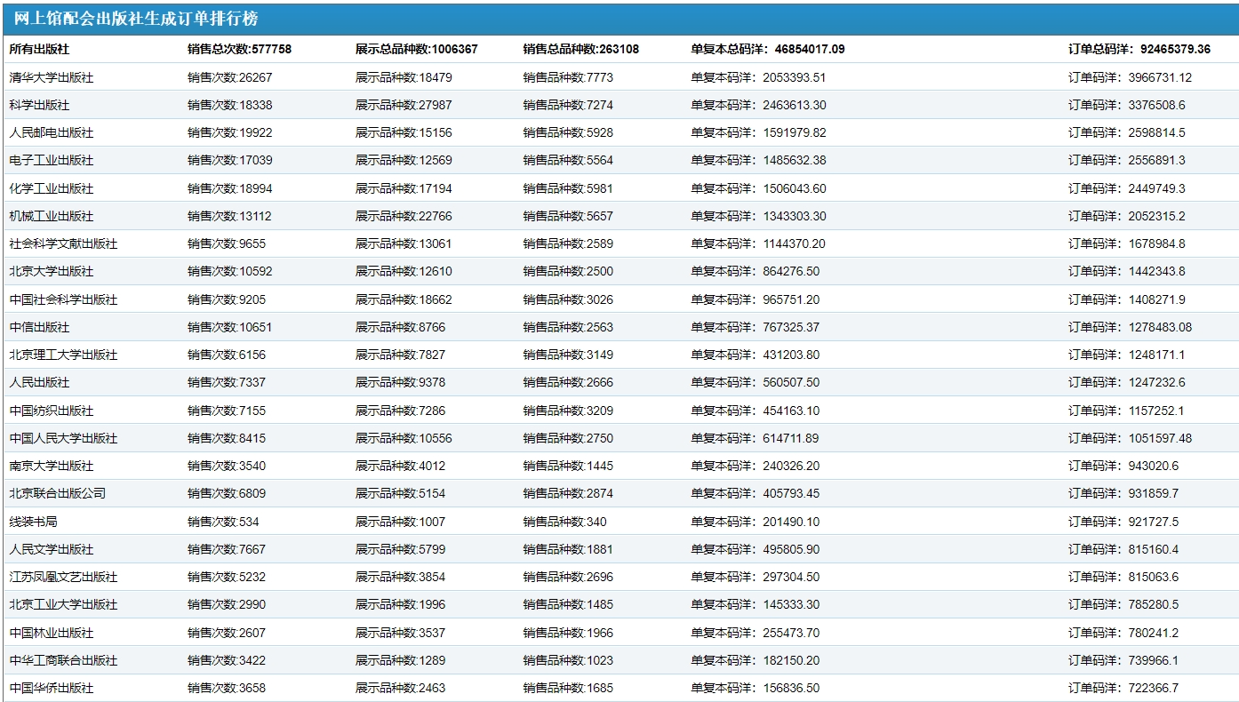 1.出版社單復(fù)本銷售碼洋百強榜 【特別提示】1.本榜單是將產(chǎn)品按單副本進行統(tǒng)計2.本榜單不包含圖書館采編人員使用采訪數(shù)據(jù)、現(xiàn)貨目錄批量下載功能和采集器掃碼選采功能形成的訂單碼洋3.網(wǎng)上館配會平臺展示圖書品種數(shù)均為出版社可供品種,并實時更新。
