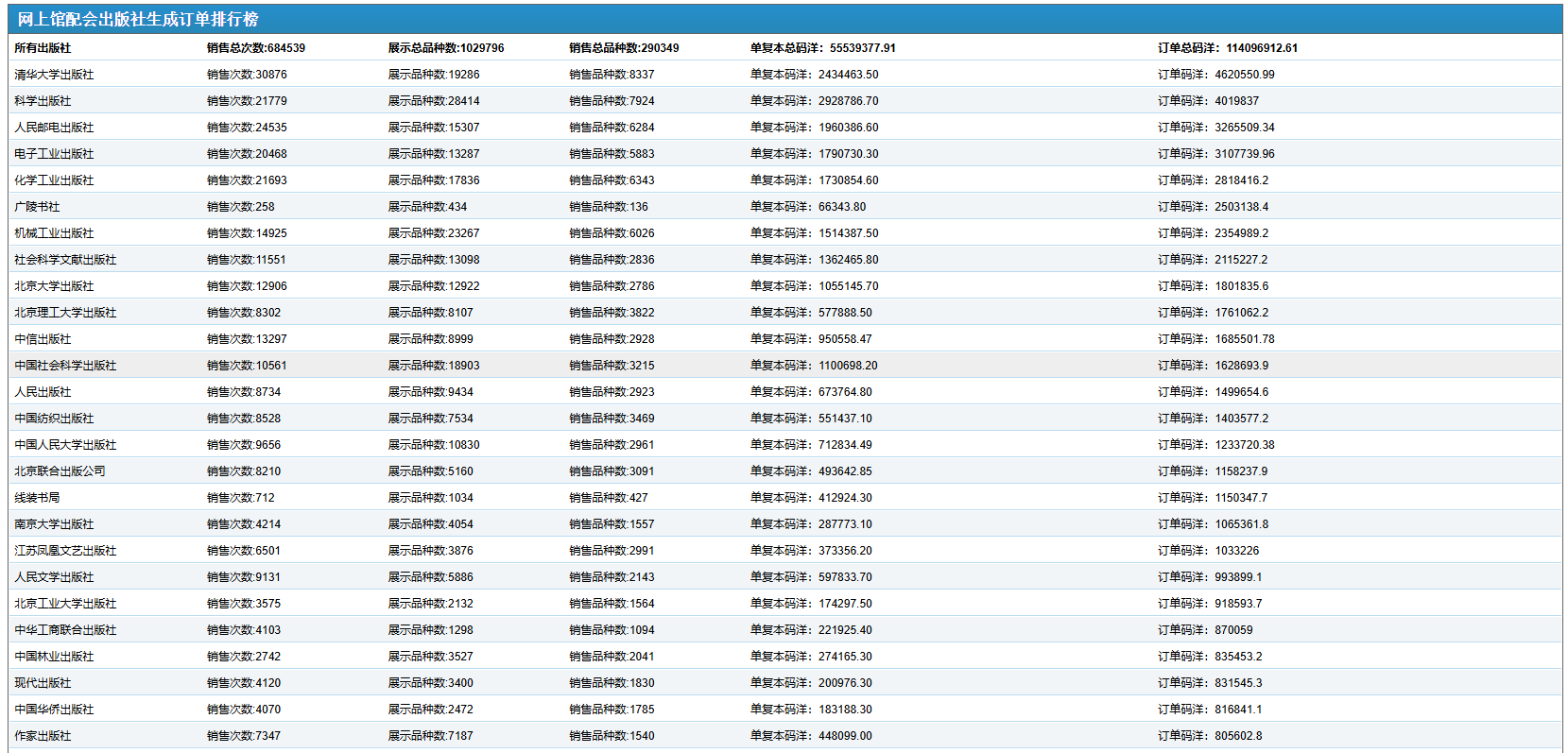 金風(fēng)送爽,2024年全國網(wǎng)上館配會選采工作進(jìn)入高潮。截止到11月5日下午14時,出版社單復(fù)本銷售碼洋達(dá)到了56,001,700.09元!2024全國網(wǎng)上館配會自2024年1月1日上線以來,參展單位涵蓋了全國98%以上的主流出版機(jī)構(gòu),包括參會出版社577家;出版商15家;館配中盤6家。 現(xiàn)將平臺各類數(shù)據(jù)統(tǒng)計列表呈現(xiàn)如下: 1. 出版社單復(fù)本銷售碼洋百強(qiáng)榜 【特別提示】 1.本榜單是將產(chǎn)品按單副本進(jìn)行統(tǒng)計 2.本榜單不包含圖書館采編人員使用采訪數(shù)據(jù)、現(xiàn)貨目錄批量下載功能和采集器掃碼選采功能形成的訂單碼洋 3.網(wǎng)上館配會平臺展示圖書品種數(shù)均為出版社可供品種,并實(shí)時更新。