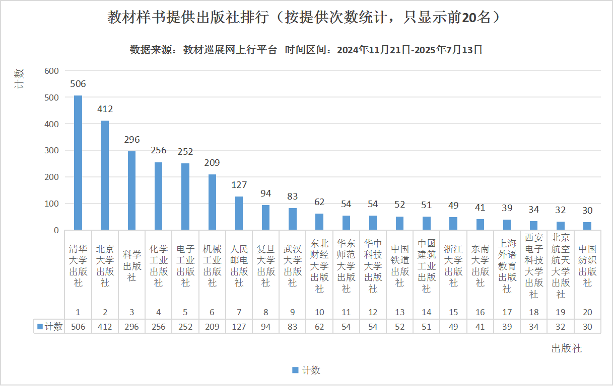 2024年11月21日,“2025全國教材巡展網(wǎng)上行”正式拉開帷幕。 本活動依托于“教材巡展網(wǎng)上行”(www.jcxzwsx.com)服務(wù)平臺,聯(lián)合科學(xué)出版社、清華大學(xué)出版社、北京大學(xué)出版社、電子工業(yè)出版社、化學(xué)工業(yè)出版社、機械工業(yè)出版社、人民郵電出版社、人民交通出版社、上海外語教育出版社、外語教學(xué)與研究出版社、中國建筑工業(yè)出版社、國防工業(yè)出版社等170家以教材出版為主的出版社,并得到了學(xué)校教材管理服務(wù)部門的大力支持,打造出一條連接出版社和各學(xué)科任課老師的教材信息交流通道,為各學(xué)科任課老師的教材選用、教材樣書免費申請、自編教材的出版等方面提供優(yōu)質(zhì)的服務(wù)。 為了滿足學(xué)校和出版社的要求,從2024年11月21日開始我們定時播報教材巡展網(wǎng)上行的各類數(shù)據(jù)統(tǒng)計,并保證數(shù)據(jù)的真實性和有效性。 截止到2025年7月13日12時(統(tǒng)計區(qū)間:2024年11月21日0時-2025年7月13日12時)訪問/展示數(shù)據(jù):