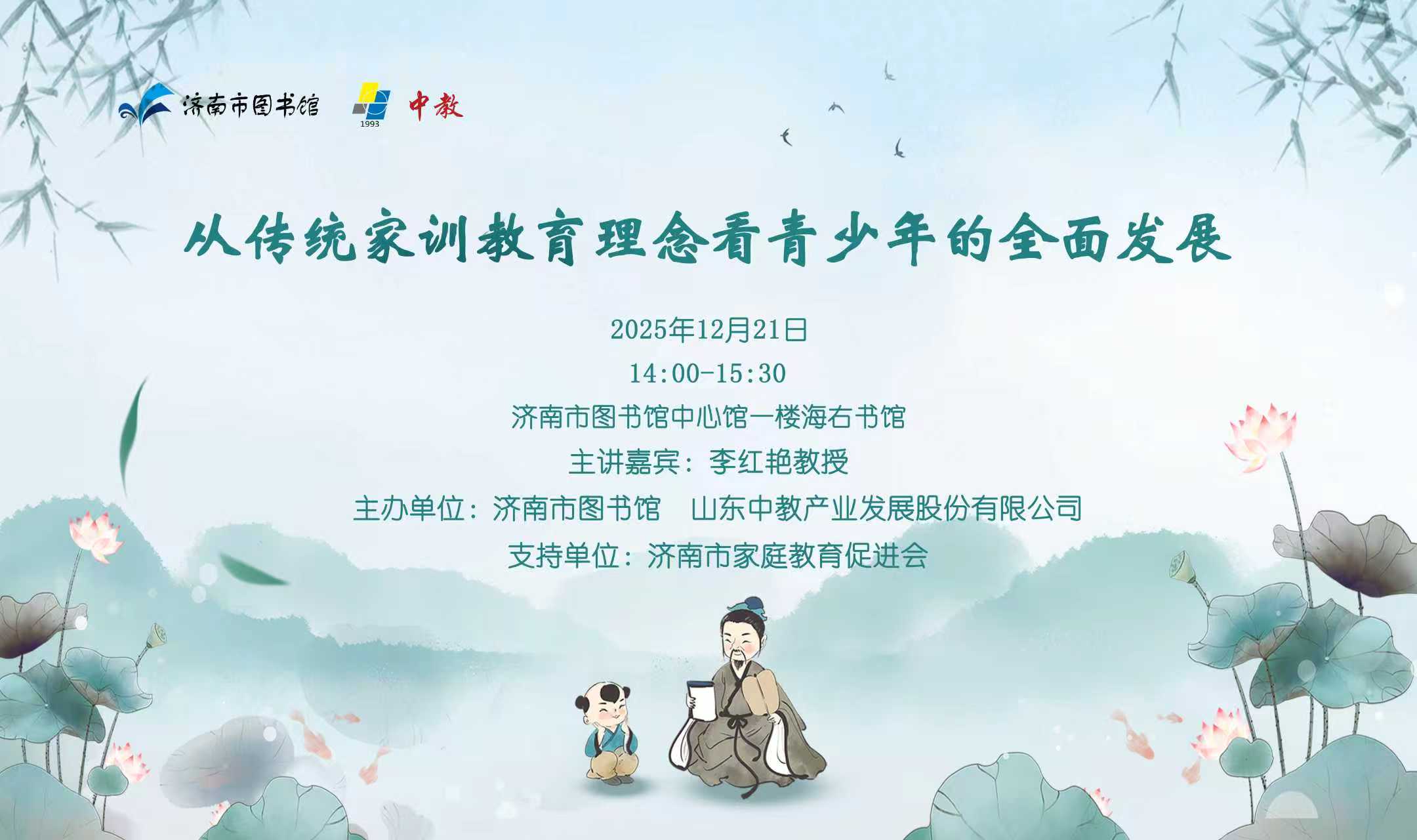 12月21日下午,由濟(jì)南市圖書館與山東中教產(chǎn)業(yè)發(fā)展股份有限公司聯(lián)合主辦、濟(jì)南市家庭教育促進(jìn)會(huì)支持的 “從傳統(tǒng)家訓(xùn)教育理念看青少年的全面發(fā)展” 主題講座在濟(jì)南市圖書館中心館一樓海右書館成功舉辦。 齊魯師范學(xué)院李紅艷教授應(yīng)邀擔(dān)任主講嘉賓,她以深厚的文化底蘊(yùn)和鮮活的案例解析,為現(xiàn)場(chǎng)百余位家長(zhǎng)與教育工作者帶來(lái)了一場(chǎng)融合傳統(tǒng)智慧與現(xiàn)代教育的思想盛宴。