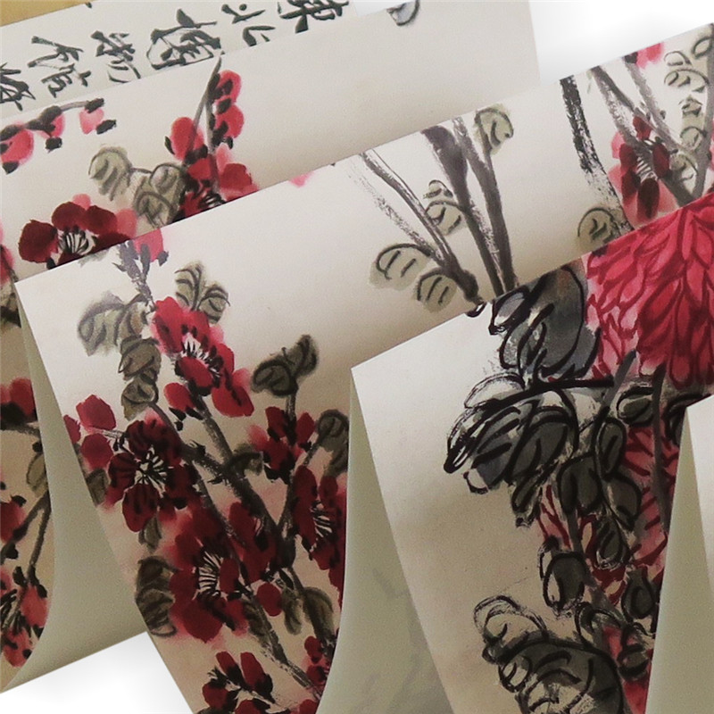 齊白石·折枝花卉圖、四色梅花圖 《折枝花卉圖》紙本設(shè)色,縱46厘米,橫369厘米。此卷描繪了紫藤、荷花、秋菊、紅梅和牡丹。據(jù)說此畫是齊白石破例為展覽無償捐贈,又在卷尾題寫說:“東北博物館將舉辦白石畫展,余以衰老畏遠(yuǎn),不能躬與其盛,為作此長卷寄之。有解人當(dāng)知,此乃余生平破例也。” 《四色梅花圖》絹本設(shè)色,縱24厘米,橫269厘米。此卷描繪了四色梅花,即紅梅、墨梅、臘梅、綠梅,在白石的作品中十分罕見。齊白石畫梅參以青藤、八大、金冬心、黃慎、揚(yáng)補(bǔ)之、吳昌碩等諸家筆法。本卷布局疏密有致,枝花交錯(cuò),開闔自如。行筆以篆法寫枝,雄渾奔放,法度嚴(yán)謹(jǐn)。梅花四色,著彩淡雅,艷而不俗。整幅章法巧妙,以兩段題跋穿插在梅花之中,在構(gòu)圖上起到了調(diào)整節(jié)奏,舒緩起伏的作用。筆法則強(qiáng)勁有力,氣韻自然透逸。
