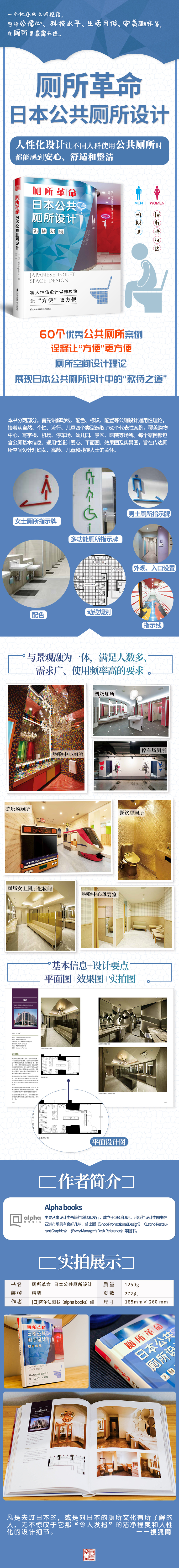 本書內(nèi)容分為兩部分: 第一部分講述廁所空間設(shè)計(jì)的動(dòng)線、配色、標(biāo)識(shí)、配置等理論 ; 第二部分從自然、個(gè)性、流行和兒童四個(gè)方面選取代表性的案例。旨在傳達(dá)廁所空間設(shè)計(jì)時(shí)對(duì)外國人、高齡、兒童和殘疾人士的關(guān)懷, 讓廁所空間設(shè)計(jì)更人性化。設(shè)計(jì)案例順應(yīng)國內(nèi)“廁所革命”的潮流, 參考性較強(qiáng)。