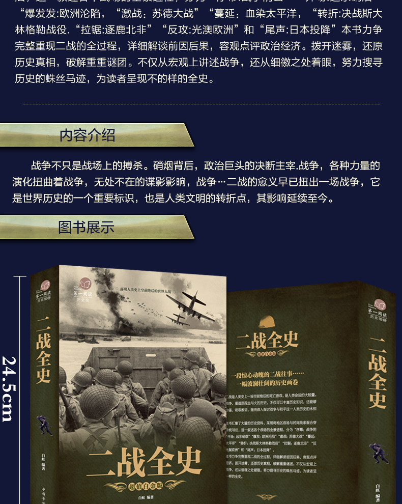 本書匯集了大量的歷史資料,采用將地區(qū)戰(zhàn)場與時間線索混合穿插的傳統(tǒng)寫法,逐一敘述各個戰(zhàn)場的全景進(jìn)程,分為“序幕:戰(zhàn)爭陰云”“開場:遠(yuǎn)東硝煙”“爆發(fā):歐洲淪陷”“激戰(zhàn):蘇德大戰(zhàn)”“蔓延:血染太平洋”“轉(zhuǎn)折:決戰(zhàn)斯大林格勒戰(zhàn)役”“拉鋸:逐鹿北非”“反攻:光復(fù)歐洲”和“尾聲:日本投降”,詳細(xì)解讀了二戰(zhàn)的前因后果并點評了當(dāng)時的政治經(jīng)濟(jì)。
