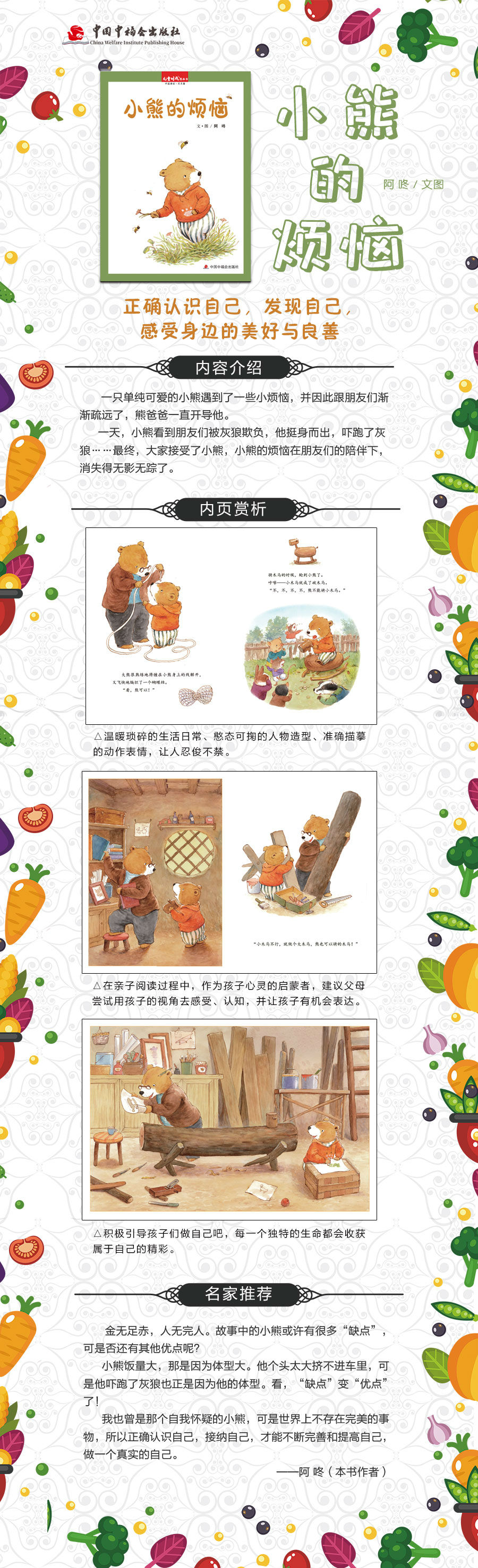 《小熊的煩惱》講述了一只單純可愛的小熊遇到了一些小煩惱,并因此跟朋友們漸漸疏遠了,熊爸爸一直開導他。一天,小熊看到朋友們被灰狼欺負,他挺身而出,嚇跑了灰狼……最終,大家接受了小熊,小熊的煩惱在朋友們的陪伴下,消失得無影無蹤了。