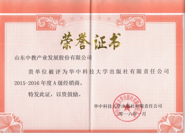 > 華中科技大學(xué)出版社2016A級(jí)經(jīng)銷(xiāo)商證書(shū)