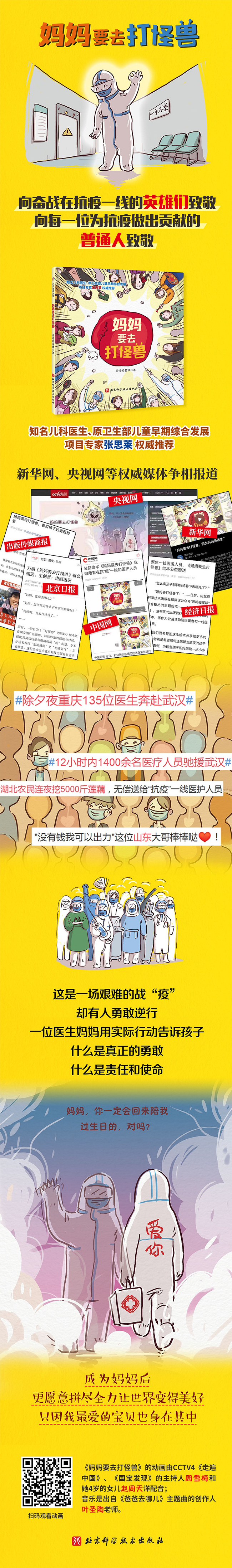 在2020年的除夕,小女孩的媽媽卻不能陪她一起看春晚,因為媽媽要去打怪獸。原來這位媽媽是一位醫(yī)生,她要去打的怪獸就是新型冠狀病毒。這本書以繪本的形式描繪了無數(shù)平凡人在面對疫情時堅守自己的崗位,勇敢抗爭疫情的故事。