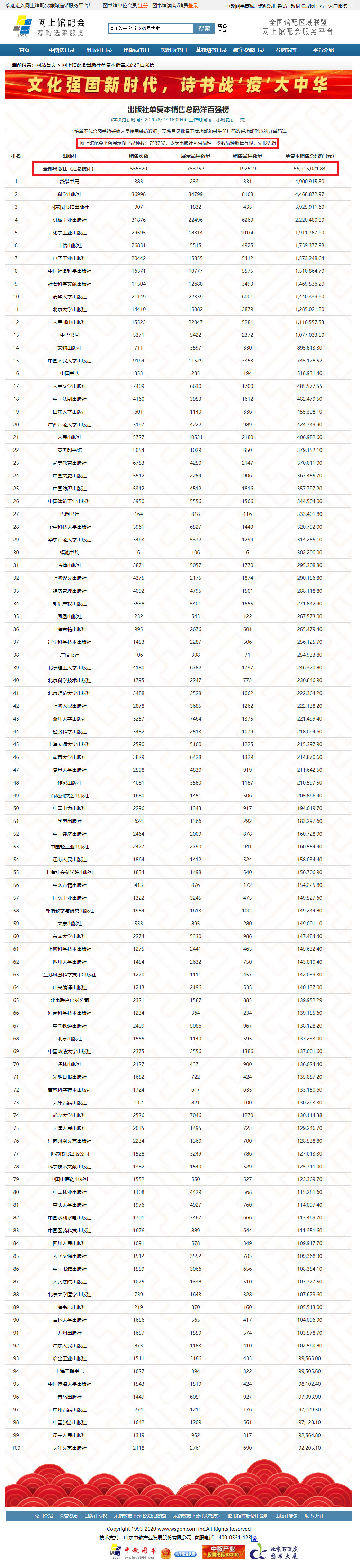 截止8月27日16時: 參會出版社(商):出版社439家、出版商33家,館配中盤1家。參會單位涵蓋了全國98%以上的主流出版機構(gòu)。 參會圖書館:高校圖書館、公共館及有選采意向的單位累計注冊使用2008家(不含中小學(xué))。其中高校圖書館和公共館合計1601家。 展示/訪問/薦購/選采數(shù)據(jù):網(wǎng)上館配會平臺頁面訪問數(shù)(PV):2521987次,IP訪問數(shù):193872次。圖書館下載采訪書目數(shù)據(jù)次數(shù):3334次(特別提示:圖書館使用此功能和采集器掃碼選采功能形成的訂單碼洋不包含在出版社單復(fù)本銷售碼洋統(tǒng)計中)。館配會平臺的在線實時出版社(商)可供品種數(shù):753752種,動態(tài)銷售品種數(shù):192519種,銷售次數(shù):555320次。 單復(fù)本銷售碼洋達到了55915021.84元! 各類數(shù)據(jù)平臺自動統(tǒng)計列表如下: 出版社單復(fù)本銷售碼洋百強榜 (特別提示:1.本榜單是將產(chǎn)品按單副本進行統(tǒng)計2.本榜單不包含圖書館采編人員使用采訪數(shù)據(jù)、現(xiàn)貨目錄批量下載功能和采集器掃碼選采功能形成的訂單碼洋;3.網(wǎng)上館配會平臺展示圖書品種數(shù)均為出版社可供品種,實時動態(tài)更新)