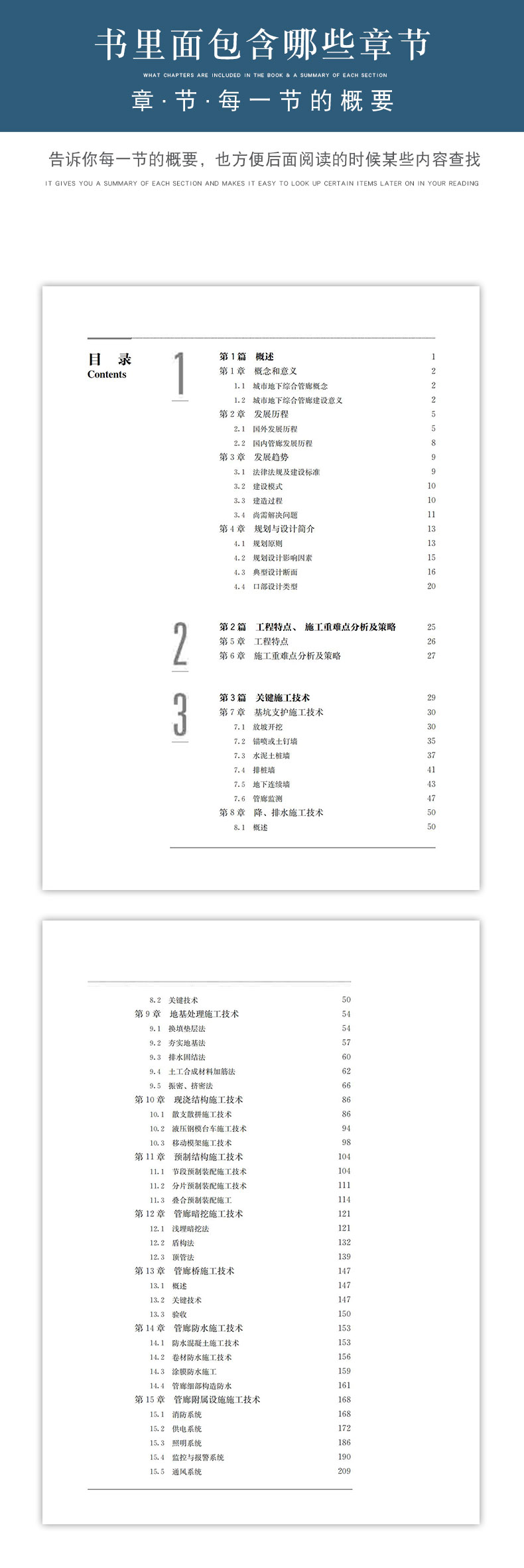 本書總結(jié)了城市地下綜合管廊關(guān)鍵施工技術(shù)及總承包管理經(jīng)驗(yàn),包括概念和意義、發(fā)展歷程、規(guī)劃與設(shè)計(jì)簡介、工程特點(diǎn)、施工重難點(diǎn)分析及策略、地下綜合管廊專項(xiàng)工程施工技術(shù)、總承包管理等方面。其中地下綜合管廊專項(xiàng)工程施工技術(shù)比較詳細(xì)的介紹了基坑支護(hù)施工技術(shù)、降排水施工技術(shù)、地基處理施工技術(shù)、現(xiàn)澆結(jié)構(gòu)施工技術(shù)、預(yù)制結(jié)構(gòu)施工技術(shù)、管廊暗挖施工技術(shù)、管廊橋施工技術(shù)、管廊防水施工技術(shù)、管廊附屬設(shè)施施工技術(shù)、入廊管線施工技術(shù)、BIM技術(shù)應(yīng)用