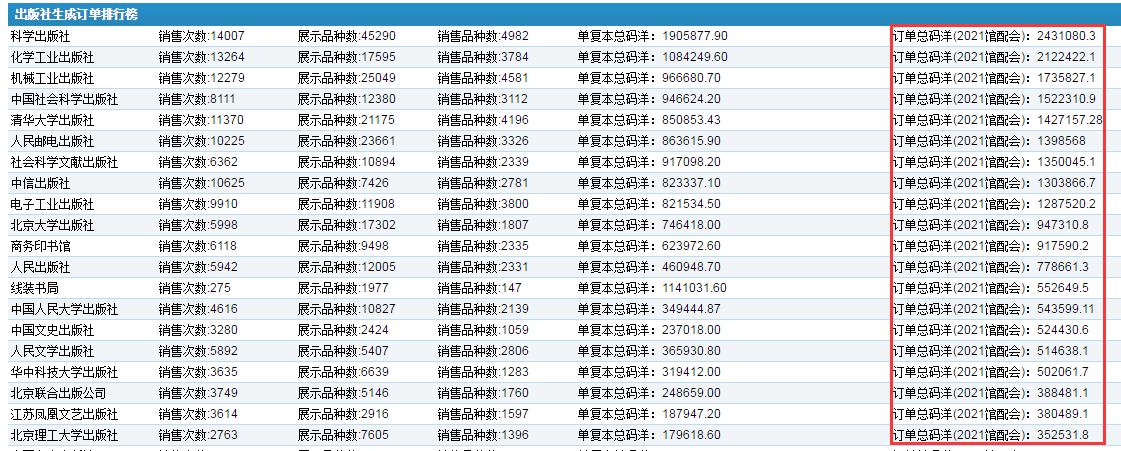 參會(huì)出版社(商):出版社467家、出版商62家,館配中盤5家。參會(huì)單位涵蓋了全國(guó)98%以上的主流出版機(jī)構(gòu)。參會(huì)圖書館:高校圖書館、公共館及有選采意向的單位累計(jì)注冊(cè)使用2962家(不含中小學(xué))。其中高校圖書館和公共館合計(jì)2257家。 展示/訪問/薦購(gòu)/選采數(shù)據(jù): 網(wǎng)上館配會(huì)平臺(tái)頁(yè)面訪問數(shù)(PV):1702768次,IP訪問數(shù):698344次。圖書館下載采訪書目數(shù)據(jù)次數(shù):4644次(特別提示:圖書館使用此功能和采集器掃碼選采功能形成的訂單碼洋不包含在出版社單復(fù)本銷售碼洋統(tǒng)計(jì)中)。館配會(huì)平臺(tái)的在線實(shí)時(shí)出版社(商)可供品種數(shù):870034種,動(dòng)態(tài)銷售品種數(shù):142131種,銷售次數(shù):319601次。 單復(fù)本銷售碼洋達(dá)到了30,100,914.24元! 各類數(shù)據(jù)平臺(tái)自動(dòng)統(tǒng)計(jì)列表如下: 出版社單復(fù)本銷售碼洋百?gòu)?qiáng)榜