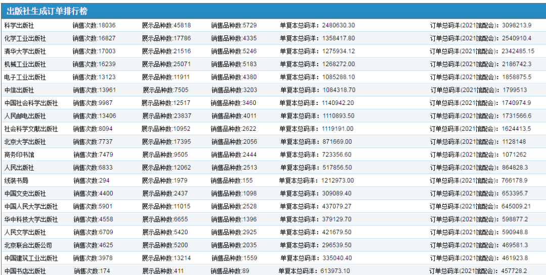 金秋九月,丹桂飄香。隨著開(kāi)學(xué)季的來(lái)臨,2021全國(guó)網(wǎng)上館配會(huì)選采也進(jìn)入了階段性高潮!2021全國(guó)網(wǎng)上館配會(huì)自2021年3月22日常態(tài)化上線服務(wù)以來(lái),截止9月15日16時(shí):參會(huì)出版社(商):出版社497家、出版商62家,館配中盤5家。參展單位涵蓋了全國(guó)98%以上的主流出版機(jī)構(gòu)。單復(fù)本銷售碼洋達(dá)到了43,153,216.45元! 各類數(shù)據(jù)平臺(tái)自動(dòng)統(tǒng)計(jì)列表如下: 出版社單復(fù)本銷售碼洋百?gòu)?qiáng)榜 (特別提示:1.本榜單是將產(chǎn)品按單副本進(jìn)行統(tǒng)計(jì)2.本榜單不包含圖書(shū)館采編人員使用采訪數(shù)據(jù)、現(xiàn)貨目錄批量下載功能和采集器掃碼選采功能形成的訂單碼洋;3.網(wǎng)上館配會(huì)平臺(tái)展示圖書(shū)品種數(shù)均為出版社可供品種,實(shí)時(shí)動(dòng)態(tài)更新) ![]() ![]() ![]() ![]() ![]() ![]()
