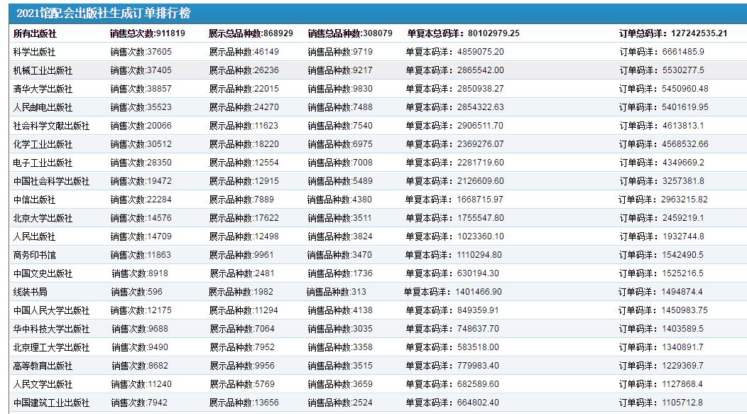 12月伊始,2021全國網上館配會選采也進入最后的沖刺階段。2021全國網上館配會自2021年3月22日常態(tài)化上線服務以來,截止12月1日16時:參會出版社(商):出版社497家、出版商62家,館配中盤5家。參展單位涵蓋了全國98%以上的主流出版機構。單復本銷售碼洋達到了80,102,979.25元! 各類數據平臺自動統(tǒng)計列表如下: 出版社單復本銷售碼洋百強榜 (特別提示:1.本榜單是將產品按單復本進行統(tǒng)計2.本榜單不包含圖書館采編人員使用采訪數據、現貨目錄批量下載功能和采集器掃碼選采功能形成的訂單碼洋;3.網上館配會平臺展示圖書品種數均為出版社可供品種,實時動態(tài)更新)