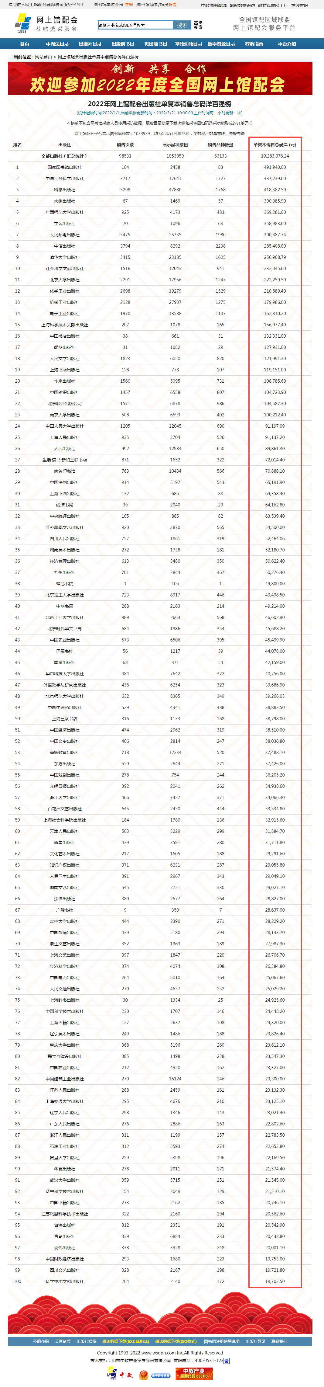 春分已至,萬象更新!隨著春季開學(xué)季拉開帷幕,2022年全國(guó)網(wǎng)上館配會(huì)選采工作開始進(jìn)入高潮,截止到3月21日上午10時(shí):出版社單復(fù)本銷售碼洋達(dá)到了10,283,076.24元!2022全國(guó)網(wǎng)上館配會(huì)自2022年1月1日上線以來,開啟全年常態(tài)化服務(wù)。參展單位涵蓋了全國(guó)98%以上的主流出版機(jī)構(gòu),包括參會(huì)出版社556家;出版商15家;館配中盤6家。 現(xiàn)將平臺(tái)各類數(shù)據(jù)統(tǒng)計(jì)列表呈現(xiàn)如下: 出版社單復(fù)本銷售碼洋百?gòu)?qiáng)榜 【特別提示】1.本榜單是將產(chǎn)品按單副本進(jìn)行統(tǒng)計(jì)2.本榜單不包含圖書館采編人員使用采訪數(shù)據(jù)、現(xiàn)貨目錄批量下載功能和采集器掃碼選采功能形成的訂單碼洋3.網(wǎng)上館配會(huì)平臺(tái)展示圖書品種數(shù)均為出版社可供品種,并實(shí)時(shí)更新。