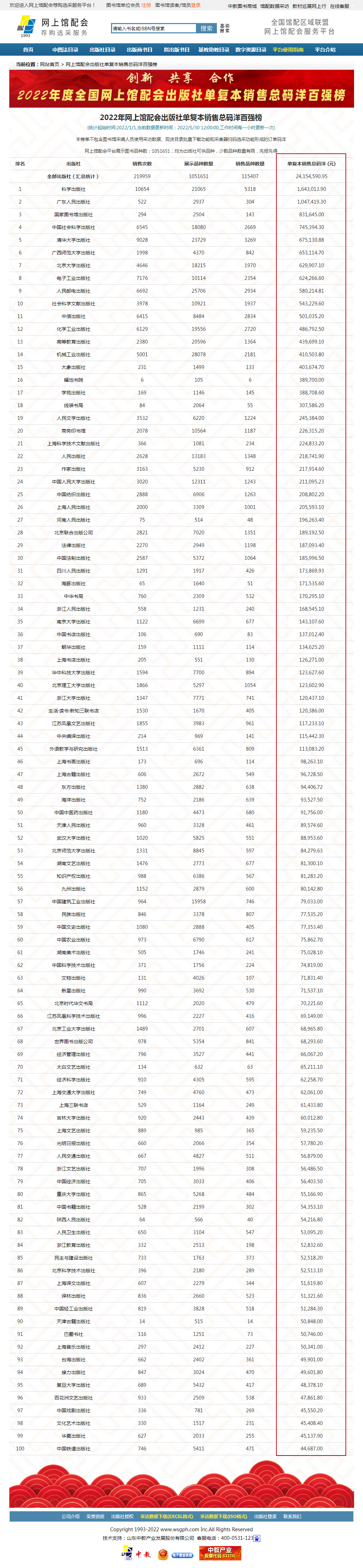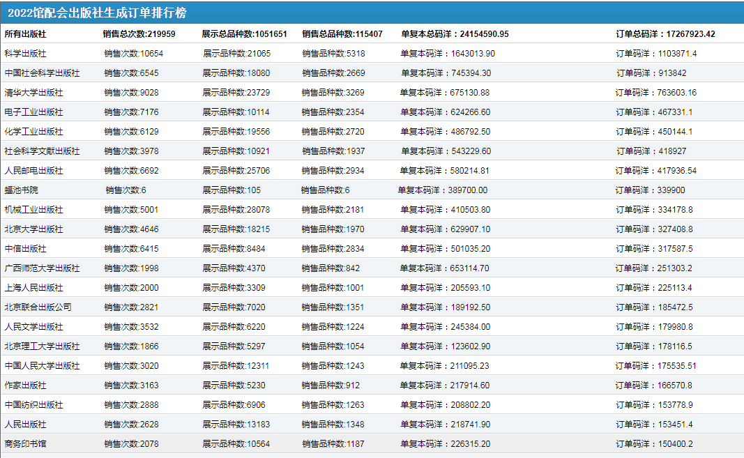夏季伊始,“2022年全國網(wǎng)上館配會(huì)”選采工作進(jìn)入了階段性高潮!截止到5月30日中午12時(shí):出版社單復(fù)本銷售碼洋達(dá)到了24,154,590.95元!2022全國網(wǎng)上館配會(huì)自2022年1月1日上線以來,開啟了全年常態(tài)化服務(wù)。參展單位涵蓋了全國98%以上的主流出版機(jī)構(gòu),包括參會(huì)出版社556家;出版商15家;館配中盤6家。 現(xiàn)將平臺(tái)各類數(shù)據(jù)統(tǒng)計(jì)列表呈現(xiàn)如下: 1.出版社單復(fù)本銷售碼洋百強(qiáng)榜 【特別提示】1.本榜單是將產(chǎn)品按單副本進(jìn)行統(tǒng)計(jì)2.本榜單不包含圖書館采編人員使用采訪數(shù)據(jù)、現(xiàn)貨目錄批量下載功能和采集器掃碼選采功能形成的訂單碼洋3.網(wǎng)上館配會(huì)平臺(tái)展示圖書品種數(shù)均為出版社可供品種,并實(shí)時(shí)更新。