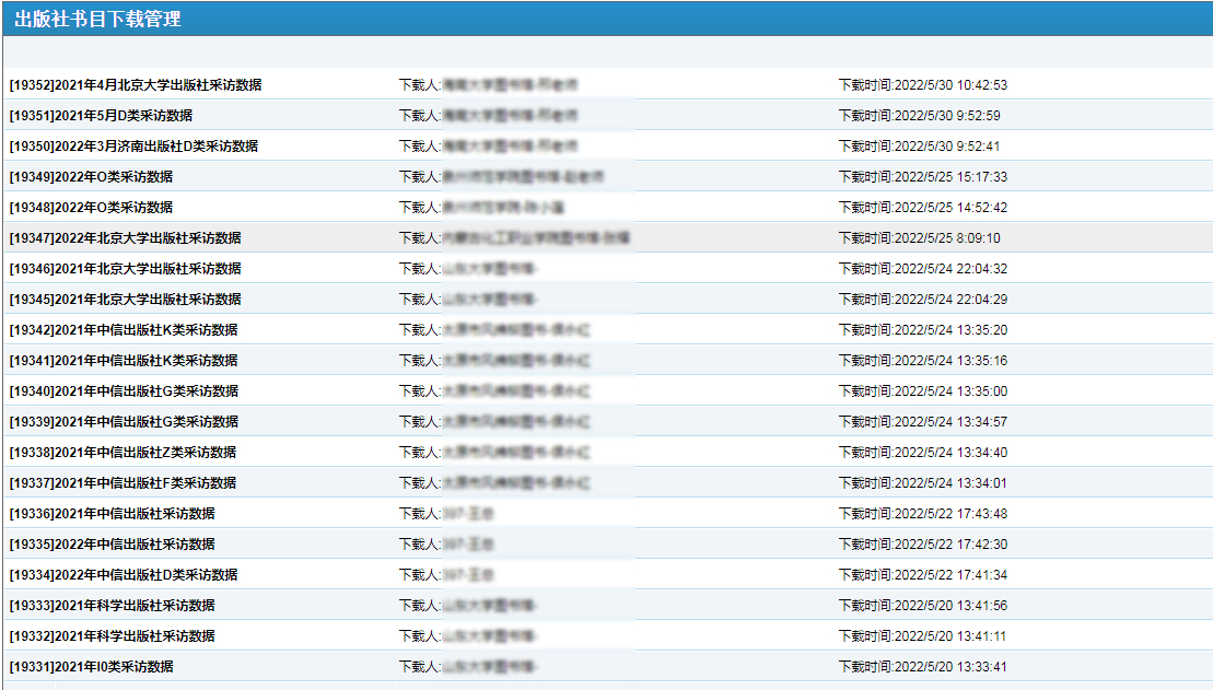 【說明】以上數(shù)據(jù)列表圖中,涉及到用戶隱私信息的部分,均已做模糊處理。 目前,網(wǎng)上館配會(huì)平臺(tái)(www.wsgph.com)已與全國79家重點(diǎn)出版社實(shí)現(xiàn)了可供書目的EDI適時(shí)對(duì)接,與近500家出版社實(shí)現(xiàn)了可供書目的模版15天對(duì)接,出版社可供書目數(shù)據(jù)與網(wǎng)上館配會(huì)服務(wù)平臺(tái)書目數(shù)據(jù)實(shí)現(xiàn)了同步。目前,平臺(tái)已有100多萬條可供書目數(shù)據(jù),便于圖書館和讀者薦購/選采。平臺(tái)強(qiáng)大的資源整合能力和海量的同步數(shù)據(jù),對(duì)出版社可供書目的時(shí)效性、全面性,以及圖書館的到書率,提供了有效保障! 在此,希望還沒有實(shí)現(xiàn)EDI數(shù)據(jù)對(duì)接的出版社,能夠充分認(rèn)識(shí)到EDI數(shù)據(jù)對(duì)接在館配服務(wù)工作中的便捷性和重要性,從而早日實(shí)現(xiàn)出版社可供書目的EDI數(shù)據(jù)對(duì)接。 另外,在加快數(shù)據(jù)同步速度的同時(shí),希望所有出版社完善圖書產(chǎn)品在直播間的播放種類,增加圖書視頻資料在平臺(tái)的播放頻次,以便更好的服務(wù)于圖書館選采工作。對(duì)于還沒有參加2022全國網(wǎng)上館配會(huì)的部分出版社,如有意向,請(qǐng)抓緊與平臺(tái)客服聯(lián)系。 我們期待更多的圖書館、出版社同仁使用“網(wǎng)上館配會(huì)”平臺(tái)(www.wsgph.com)。