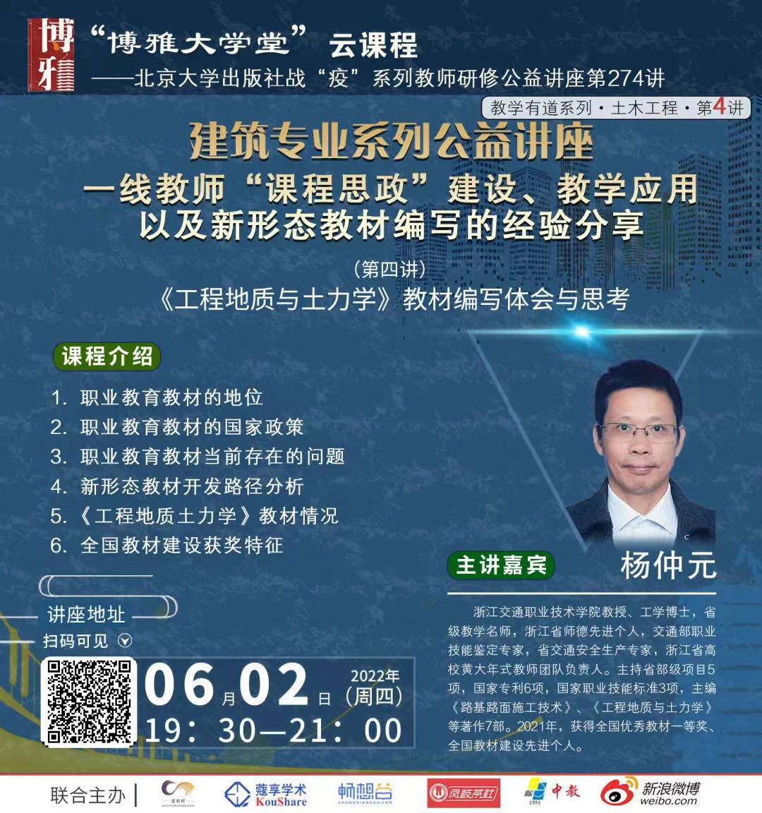 > 建筑專業(yè)系列公益講座一線教師“課程思政”建設(shè)、教學(xué)應(yīng)用以及新形態(tài)教材編寫的經(jīng)驗分享(第四講)《工程地質(zhì)與土力學(xué)》教材編寫體會與思考——楊仲元