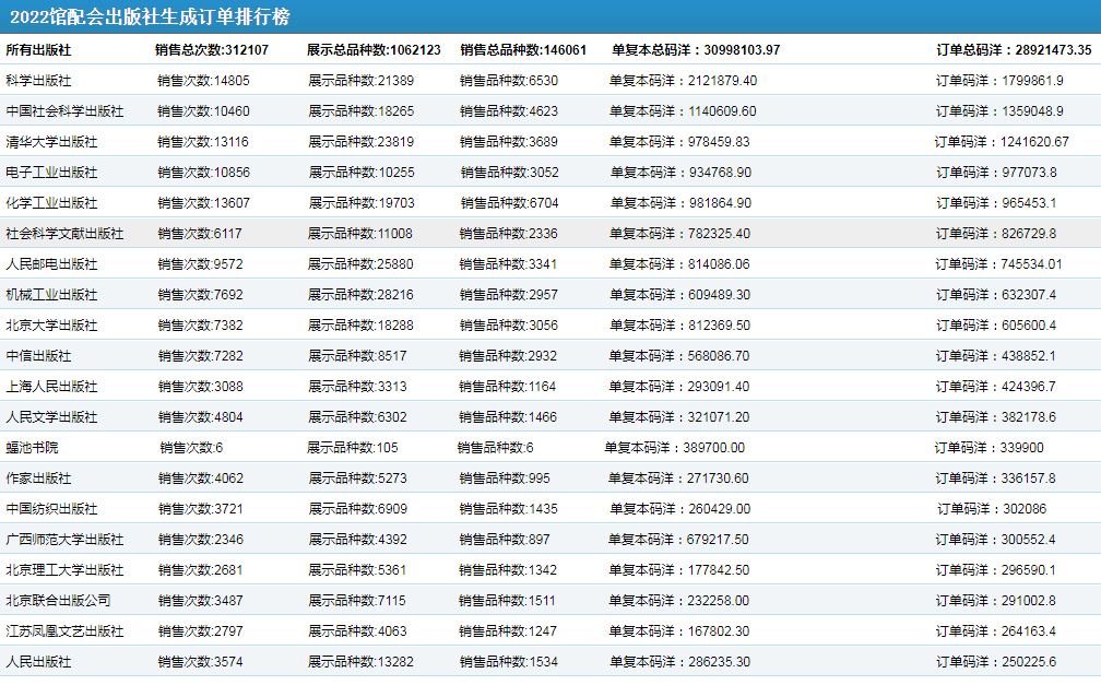 炎炎夏日,驕陽似火,“2022年全國網上館配會”選采工作進入了階段性的高潮!截止到6月30日下午14時:出版社單復本銷售碼洋達到了31,000,825.57元!2022全國網上館配會自2022年1月1日上線以來,開啟了全年常態(tài)化服務。參展單位涵蓋了全國98%以上的主流出版機構,包括參會出版社556家;出版商15家;館配中盤6家。 現將平臺各類數據統(tǒng)計列表呈現如下: 1.出版社單復本銷售碼洋百強榜 【特別提示】1.本榜單是將產品按單副本進行統(tǒng)計2.本榜單不包含圖書館采編人員使用采訪數據、現貨目錄批量下載功能和采集器掃碼選采功能形成的訂單碼洋3.網上館配會平臺展示圖書品種數均為出版社可供品種,并實時更新。