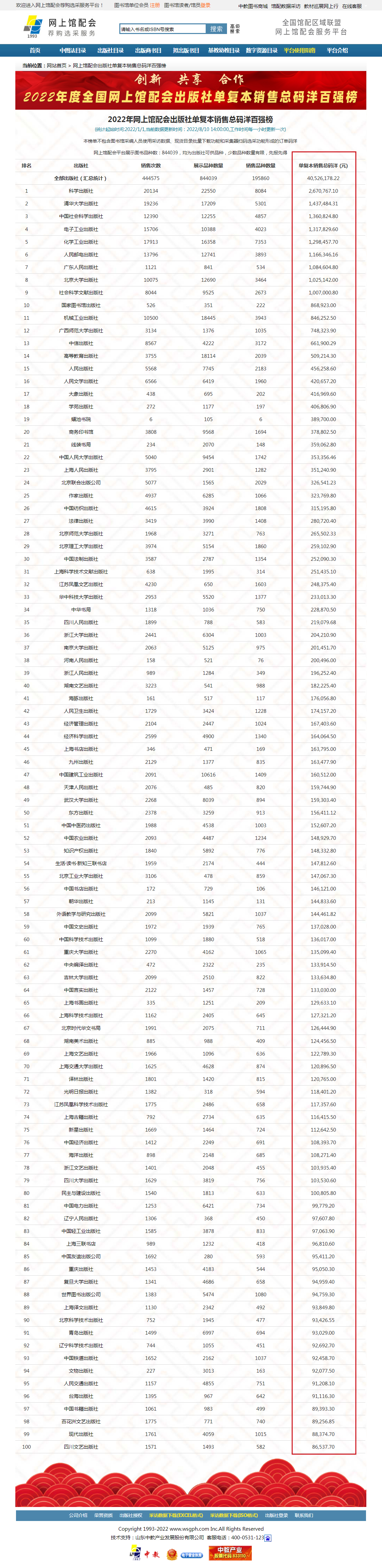 時至八月,三伏正中,“2022年全國網上館配會”選采工作進入了階段性的高潮!截止到8月10日下午14時:出版社單復本銷售碼洋達到了40,526,178.22元!2022全國網上館配會自2022年1月1日上線以來,開啟了全年常態(tài)化服務。參展單位涵蓋了全國98%以上的主流出版機構,包括參會出版社556家;出版商15家;館配中盤6家。 現(xiàn)將平臺各類數據統(tǒng)計列表呈現(xiàn)如下: 1.出版社單復本銷售碼洋百強榜 【特別提示】1.本榜單是將產品按單副本進行統(tǒng)計2.本榜單不包含圖書館采編人員使用采訪數據、現(xiàn)貨目錄批量下載功能和采集器掃碼選采功能形成的訂單碼洋3.網上館配會平臺展示圖書品種數均為出版社可供品種,并實時更新。