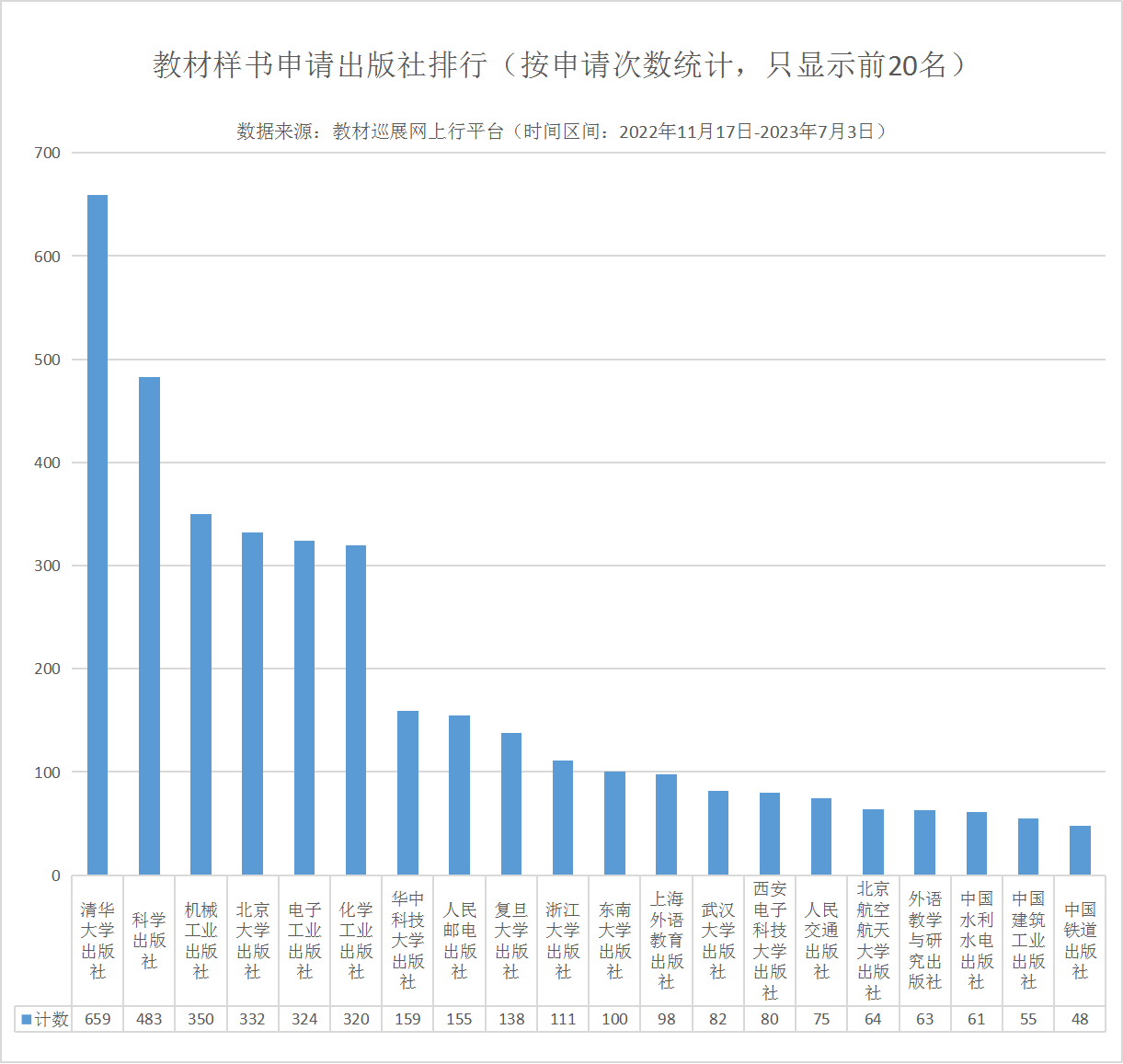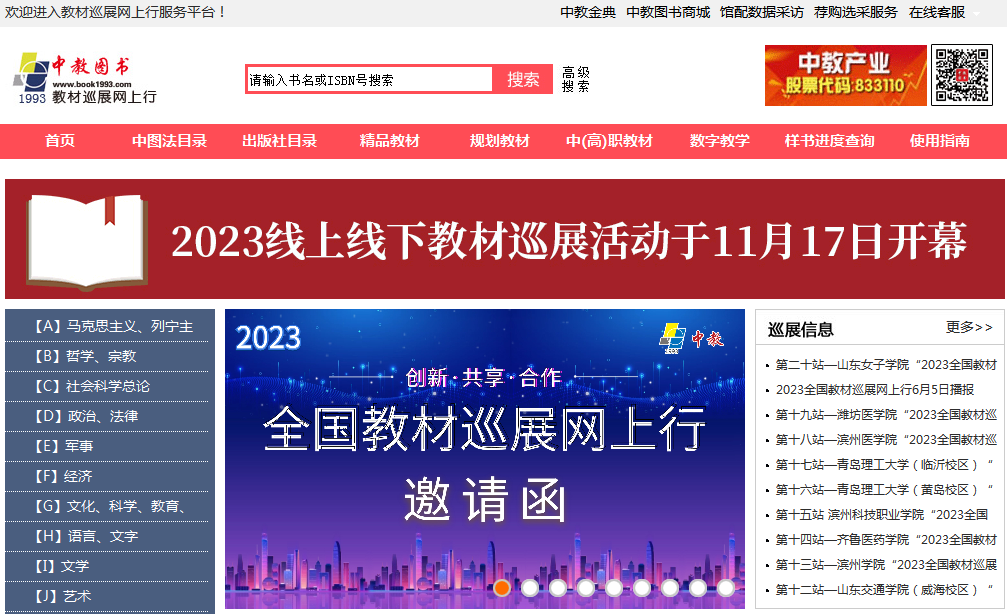 2022年11月17日,“2023全國教材巡展網(wǎng)上行”正式拉開帷幕。 本次活動(dòng)依托于“教材巡展網(wǎng)上行”(www.jcxzwsx.com)服務(wù)平臺(tái),聯(lián)合科學(xué)出版社、清華大學(xué)出版社、北京大學(xué)出版社、電子工業(yè)出版社、化學(xué)工業(yè)出版社、機(jī)械工業(yè)出版社、人民郵電出版社、人民交通出版社、上海外語教育出版社、外語教學(xué)與研究出版社、復(fù)旦大學(xué)出版社、國防工業(yè)出版社等169家以教材出版為主的出版社,并得到了學(xué)校教材管理服務(wù)部門的大力支持,打造出一條連接出版社和各學(xué)科任課老師的教材信息交流通道,為各學(xué)科任課老師的教材選用、教材樣書免費(fèi)申請(qǐng)、自編教材的出版等方面提供優(yōu)質(zhì)的服務(wù)。 “2023全國教材巡展網(wǎng)上行”上線以來,得到了高校教材管理部門及出版社同仁的大力支持及肯定,在此我們深表感謝!為了滿足學(xué)校和出版社的要求,從2022年11月17日開始我們定時(shí)播報(bào)教材巡展網(wǎng)上行的各類數(shù)據(jù)統(tǒng)計(jì),并保證數(shù)據(jù)的真實(shí)性和有效性。