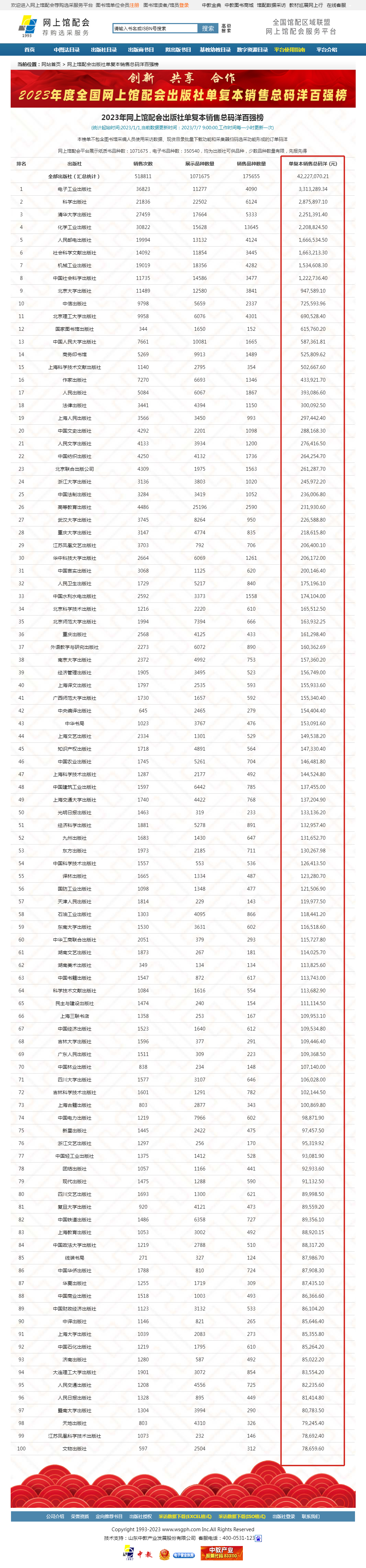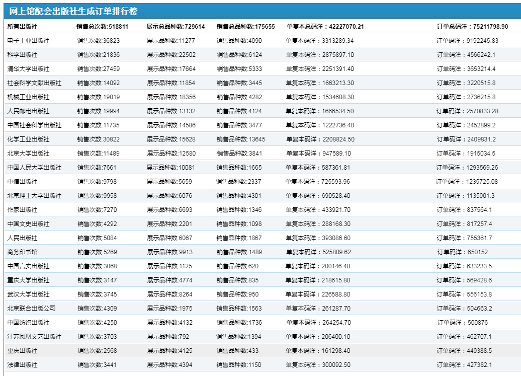 炎炎夏日,驕陽似火!2023年全國網(wǎng)上館配會”選采工作進(jìn)入了階段性高潮。截止到7月7日上午9時:出版社單復(fù)本銷售碼洋達(dá)到了42,227,070.21元!2023全國網(wǎng)上館配會自2023年1月1日上線以來,開啟了全年常態(tài)化服務(wù)。參展單位涵蓋了全國98%以上的主流出版機構(gòu),包括參會出版社577家;出版商15家;館配中盤6家。 現(xiàn)將平臺各類數(shù)據(jù)統(tǒng)計列表呈現(xiàn)如下: 1.出版社單復(fù)本銷售碼洋百強榜 【特別提示】1.本榜單是將產(chǎn)品按單復(fù)本進(jìn)行統(tǒng)計2.本榜單不包含圖書館采編人員使用采訪數(shù)據(jù)、現(xiàn)貨目錄批量下載功能和采集器掃碼選采功能形成的訂單碼洋3.網(wǎng)上館配會平臺展示圖書品種數(shù)均為出版社可供品種,并實時更新。