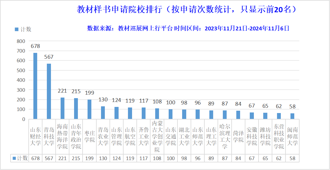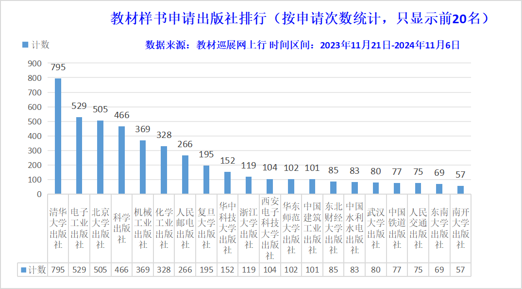 2023年11月21日,“2024全國(guó)教材巡展網(wǎng)上行”正式拉開帷幕。 本次活動(dòng)依托于“教材巡展網(wǎng)上行”(www.jcxzwsx.com)服務(wù)平臺(tái),聯(lián)合科學(xué)出版社、清華大學(xué)出版社、北京大學(xué)出版社、電子工業(yè)出版社、化學(xué)工業(yè)出版社、機(jī)械工業(yè)出版社、人民郵電出版社、人民交通出版社、上海外語教育出版社、外語教學(xué)與研究出版社、復(fù)旦大學(xué)出版社、國(guó)防工業(yè)出版社等170家以教材出版為主的出版社,并得到了學(xué)校教材管理服務(wù)部門的大力支持,打造出一條連接出版社和各學(xué)科任課老師的教材信息交流通道,為各學(xué)科任課老師的教材選用、教材樣書免費(fèi)申請(qǐng)、自編教材的出版等方面提供優(yōu)質(zhì)的服務(wù)。 “2024全國(guó)教材巡展網(wǎng)上行”上線以來,得到了高校教材管理部門及出版社同仁的大力支持及肯定,在此我們深表感謝!為了滿足學(xué)校和出版社的要求,從2023年11月21日開始我們定時(shí)播報(bào)教材巡展網(wǎng)上行的各類數(shù)據(jù)統(tǒng)計(jì),并保證數(shù)據(jù)的真實(shí)性和有效性。